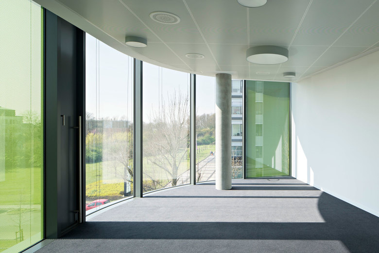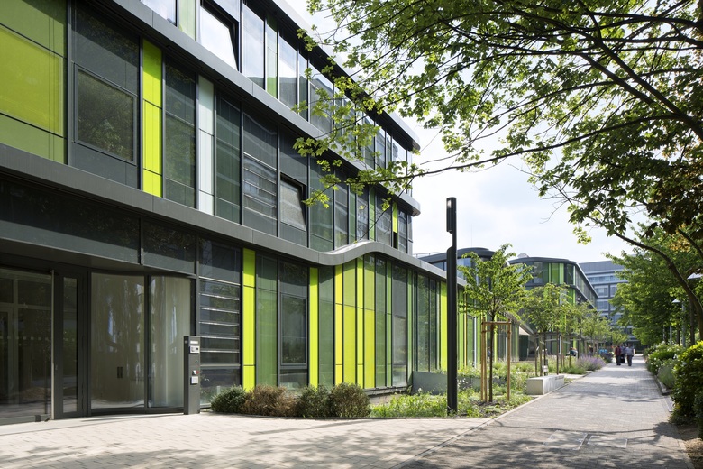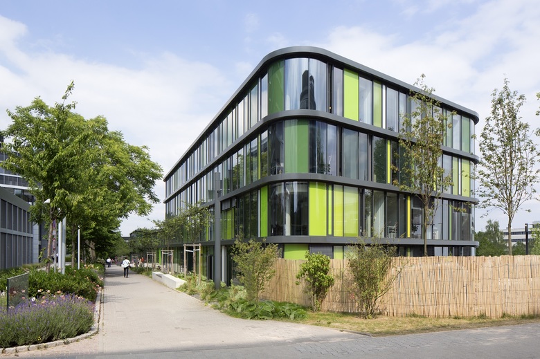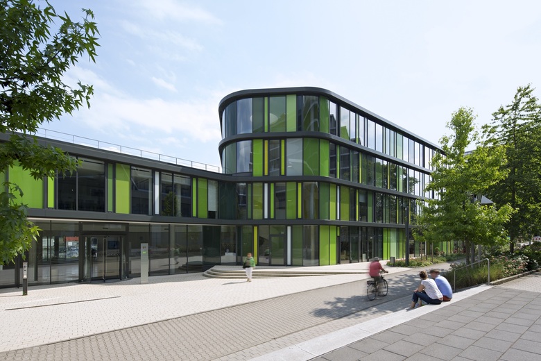 Unser Büro wurde 2010 mit der Planung des Neubaus von ‘Haus 5’ auf dem Firmengelände der GIZ in Eschborn beauftragt. Das Bürogebäude mit Kita fasst den Firmencampus im südwestlichen Bereich. Durch die vor- und zurückschwingende Fassade ergibt sich ein Vorplatz, der den eigenen Zugang ebenso betont, wie den des unmittelbar gegenüber liegenden Haupthauses. Die effizienten Grundrisse weiten sich in den Flurbereichen in unregelmäßigen Abständen zu Kommunikations- und Nutzungszonen auf und lassen stets einen direkten Sichtbezug zum Campus zu. Der Neubau schließt an das bestehende ‘Haus 4’ an, dessen Sanierung unser Büro ebenfalls übernommen hat. Die mit farbigen Glaspaneelen vertikal gegliederten Fassadenbänder des Neubaus greifen auf das sanierte Gebäude über und vereinheitlichen damit die Gesamterscheinung beider Häuser.