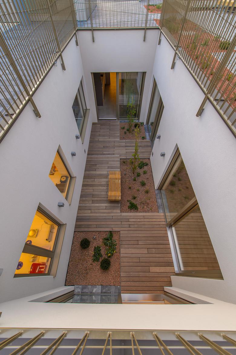 den begrünten Innenhof erfolgen kann. Das Verbindungselement ist das zentrale Stiegenhaus mit