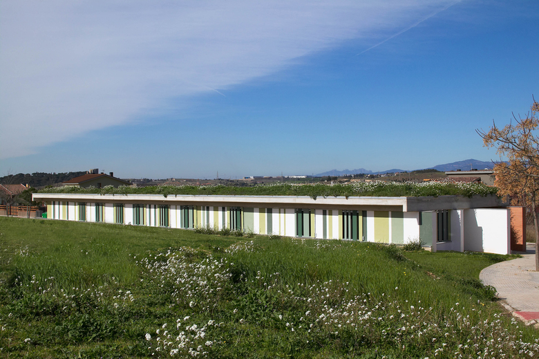 This healthcare centre is located on a site at the end of a hillside where it shares space with a green area for public use. The project plans identified this situation and addressed it by blending the facility into the park’s garden zone, burying part of the building and landscaping on its roof using local greenery, thereby creating continuity with the green area and merging with it. The windows were protected with slates in green tones to enhance the continuity of the slope as well as to guarantee solar protection and privacy within the centre.