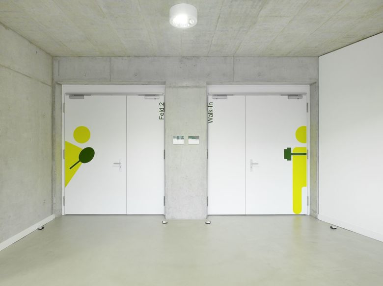 Die Gestaltung im Innern dagegen setzt kräftige Farbakzente in gelb und grün grauen Betonflächen entgegen. Interessante Blickbezüge wurden gezielt durch Lufträume zwischen den Etagen inszeniert und verbinden so Entree und Sportbereiche mit dem Verwaltungsteil. Innenräume fließen so in einander über und in durch großflächige Verglasungen auch in den Außenraum.