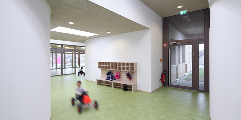 Das Kinderhaus besteht aus fünf Gruppen, zwei Gruppen für je 15 Kinder im Alter von 0-3 Jahren, drei Gruppen sind altersgemischte Gruppen für je 15 Kinder im Alter von 0-6 Jahren. Verwaltung, Personal, Haustechnik, Hauswirtschaft und Lager wurden nahe des Vorbereichs und des Eingangs angeordnet. Förderbereiche, Waschräume und Küche liegen in der zentralen Raumspange. Gruppenräume, Ruhe- und Spielbereiche öffnen sich zum gemeinschaftlich genutzten Außenraum.