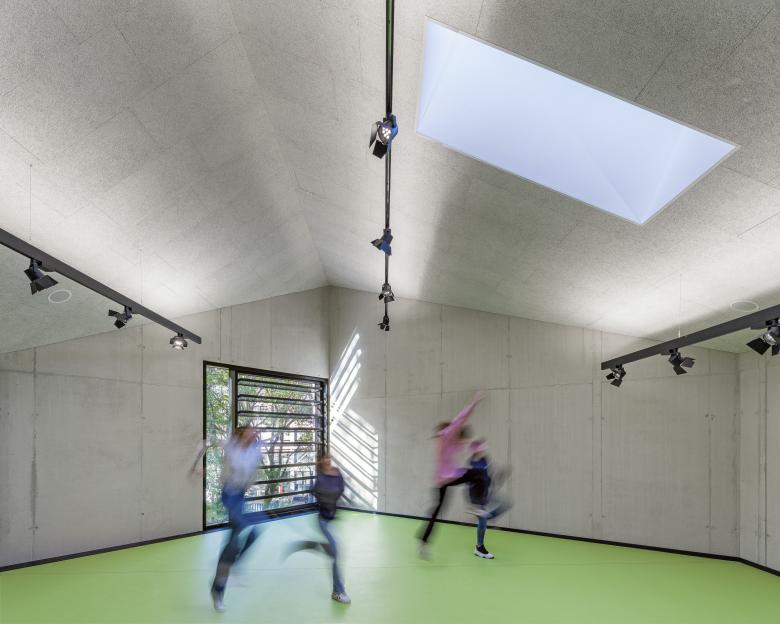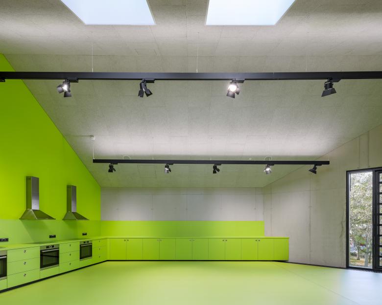 mobile Bühne und beim Kochatelier wurden alle technischen Einrichtungen an der Wand platziert um die Multifunktionalität des Raumes zu erhalten. Direkter Nachbar des MAG ist eine Jugendeinrichtungen als aktiver Teil der Bildungslandschaft, welche durch einen bunten Kiosk reger Treffpunkt des anliegenden Spielplatzes und Park geworden ist.