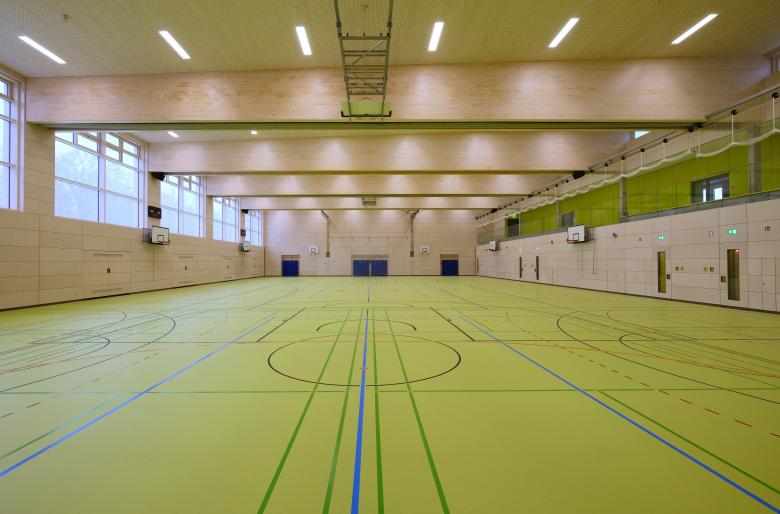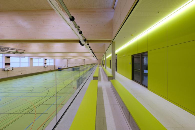 Die Sporthalle wurde als kompakter Baukörper konzipiert und ist im Volumen differenziert. Der höhere Hallenbereich wird an den Längsseiten durch niedrigere Baukörper ergänzt: