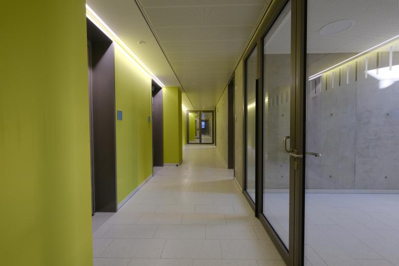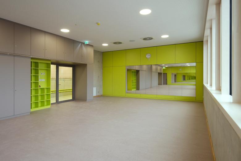 Der südliche dreigeschossige Baukörper beinhaltet im EG den Eingang, die Hausmeisterwohnung mit Hausmeisterwerkstatt sowie verschiedene Technikflächen, im 1. OG die Umkleiden und die Hallenfläche sowie im 2. OG den Konditions- und Multifunktionsraum und die Tribüne für max. 199 Personen mitsamt Besucher-WC.