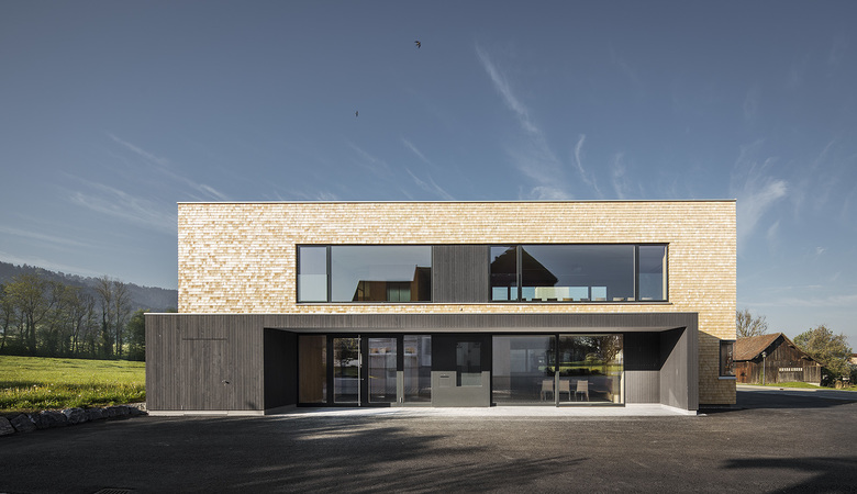 Das Grundstück für den Neubau des Feuerwehrhauses Hohenweiler liegt an der Landesstraße unmittelbar am Eingang zum eigentlichen Ortszentrum. Durch die Positionierung des 12m hohen Turms ortsauswärts gelingt es, städtebaulich den Beginn des tatsächlichen Ortszentrums im stark zergliederten Gemeindegebiet zu markieren. Gemeinsam mit dem Kirchturm auf der anderen Straßenseite bildet er einen der Hochpunkte im Dorfgefüge.