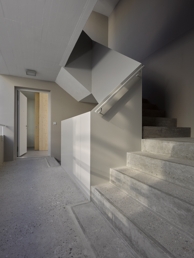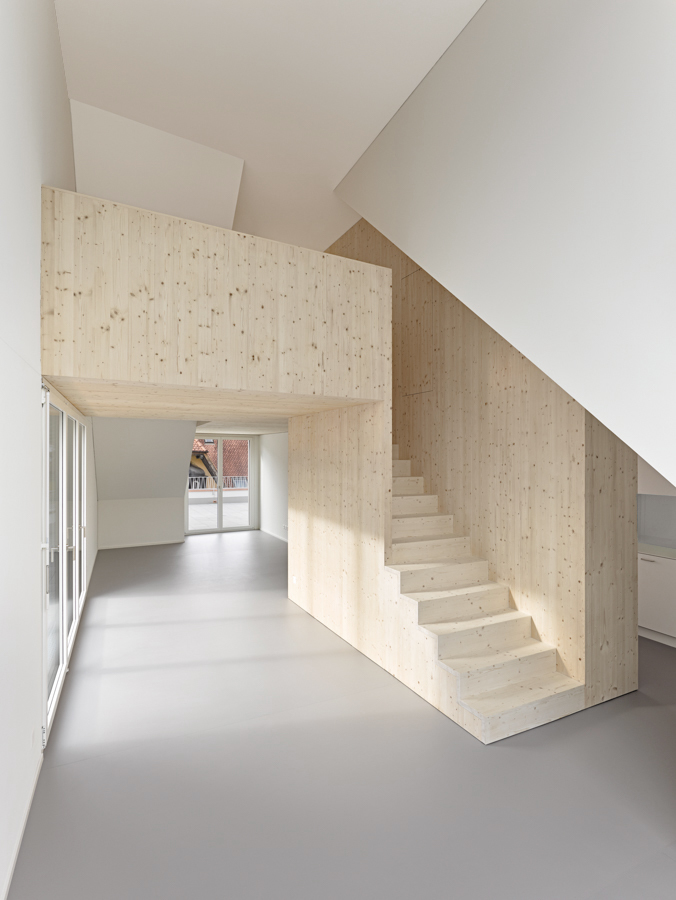 Das im Herbst 2015 fertiggestellte Mehrfamilienhaus im Dorfkern von Sarnen ist ein prägnanter Ersatzneubau für ein Wohn- und Geschäftshaus aus den 50er Jahren. Auf einer schmalen Parzelle behauptet sich der hohe Gebäudekörper entlang der Grundstrasse dank seiner expressiven Dachform selbstbewusst gegenüber den grossen Flachdach-Bürogebäuden im Süden und Osten, reagiert aber nordseitig mit einem Höhenversatz auch auf die Körnung der filigraneren Dorfhäuser und der denkmalgeschützten Gebäudegruppe im Westen.