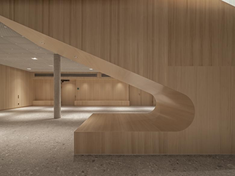 Vom Foyer aus verteilen sich die Besucher in die bestuhlte untere Hallenebene oder auf den Tribünenbereich. Der Hallenraum ist zum Foyer offen und erlebbar. Ein transparentes Raumgefüge bietet Orientierung und bringt viel Tageslicht ins Gebäude. Schiebeelemente ermöglichen die Trennung und Verbindung des Hallenbereiches vom/ zum Foyer für Veranstaltungen die hohe Anforderungen an Verdunkelung und akustischer Abgrenzung zum Foyer haben. Eine große Freitreppe bringt Tageslicht auch in die untere Ebene des Foyers. Die Schüler erreichen das Gebäude über einen Eingang, der direkt an das Schulareal angrenzt, und gelangen so zur Mensa. Zum Sportunterricht gelangen die Schüler über die unterirdische Verbindung von der Schule zu den Umkleiden. Die Anlieferzone für die Küche und den Hallenbereich befindet sich auf der Nordseite des Gebäudes und funktioniert unabhängig. Über einen Lastenaufzug kann der Hallenbereich direkt beliefert werden, ohne dass der Weg der Schüler zur Mensa dadurch beeinträchtigt wird.