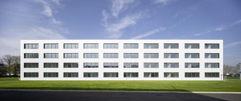 Der horizontale Charakter der Fassade wird durch klar definierte Fenstereinschnitte und liegende Aluminiumpaneele betont, Fluchttreppenhäuser dienen als transparente Zäsuren und lockern die strenge Horizontalität auf.