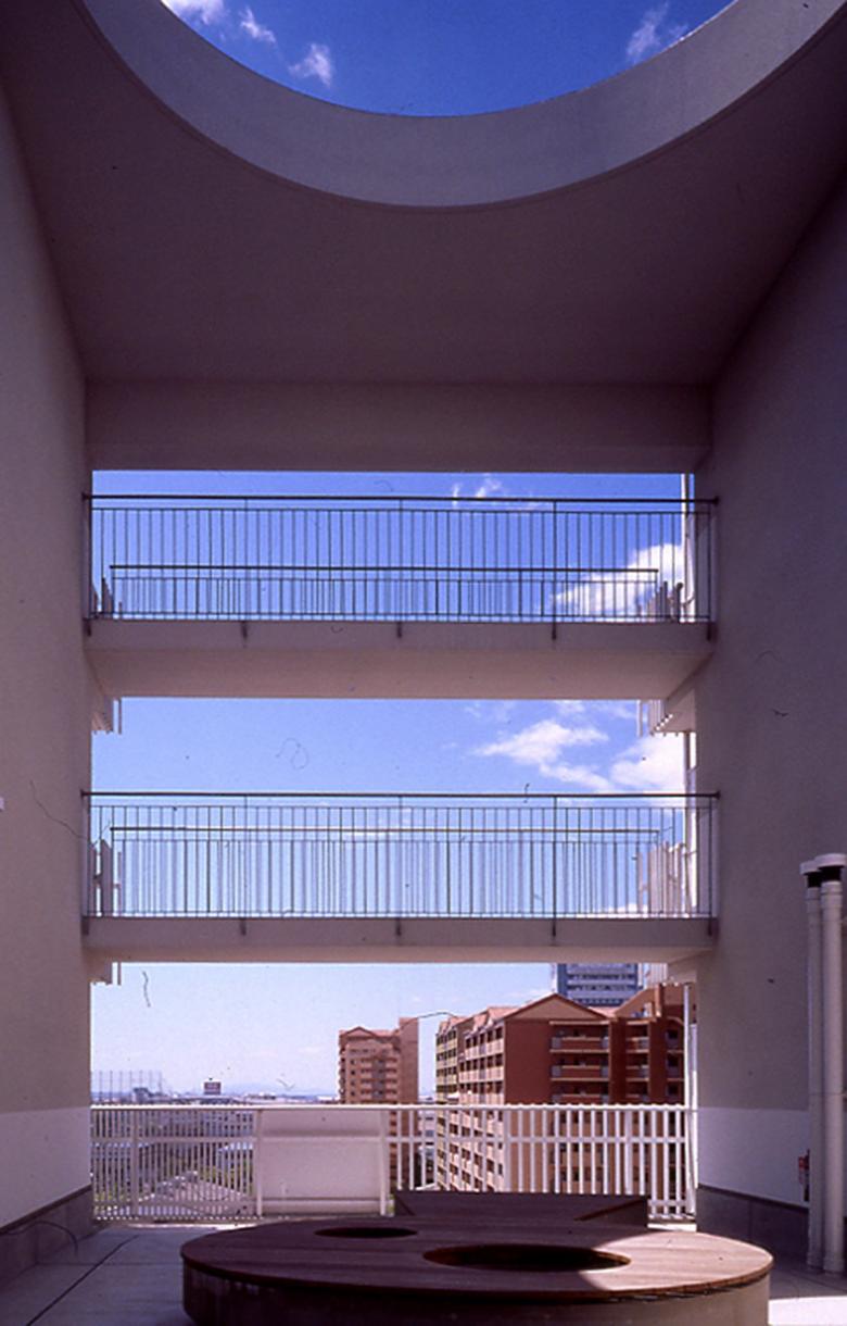 住棟にランダムに開けられた空中広場は、蛇行しながら続く片廊下の小さな溜りとなって、子供たちのプレイロットとしても機能し、高層化に伴って失われがちな接地性を補う。また屋上庭園からは大阪のベイエリアを一望することができる。海に開けた視界は、居住者の意識の中で隔絶しがちな工業地帯の景色とこの居住エリアとを接続するだろう。