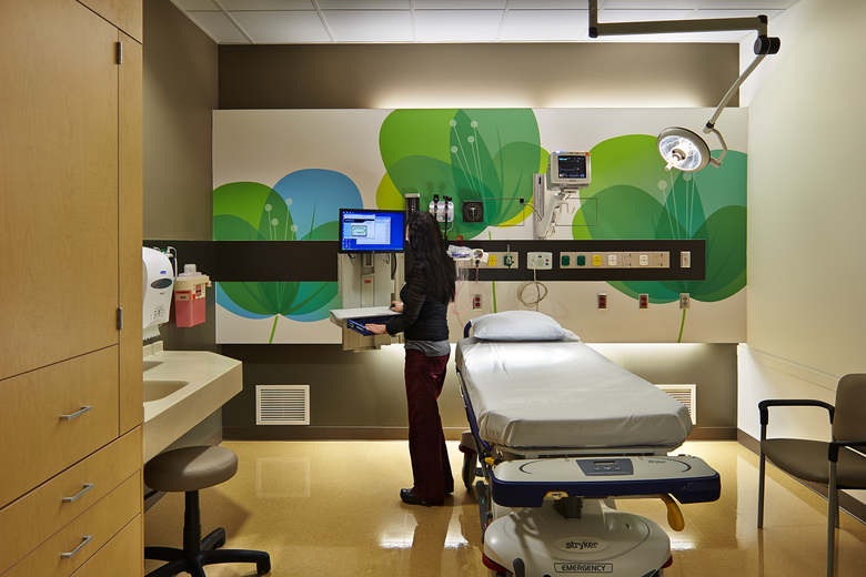 Within the clinical core, a central care team zone co-locates physicians, nurses and mid-level providers close to patient care areas, facilitating collaboration and reducing travel distance. Glass partitions allow visual connections while maintaining acoustical privacy. Bright graphics in treatment and exam rooms introduce the energy of the outdoors to these typically stressful places and underscore an enhanced awareness of the potential of nature to contribute to healing.