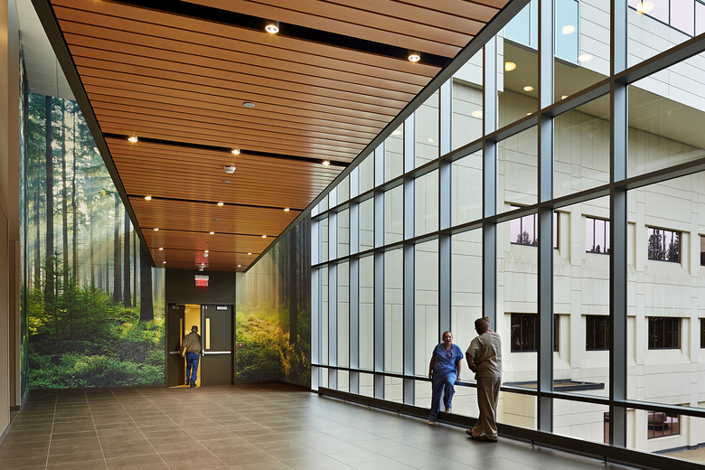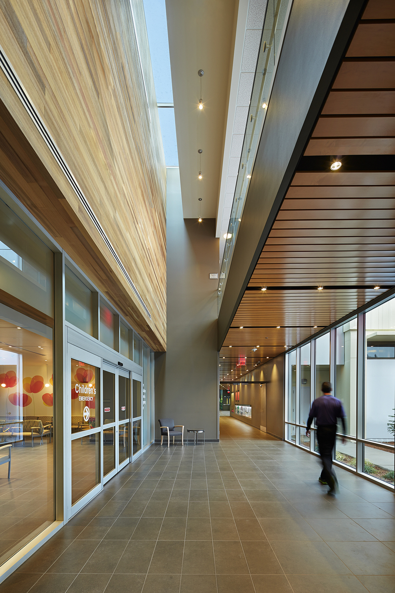 Inside the sheltered drop-off zone, a double-height atrium accented by wood and warm colors welcomes visitors. Small, light-filled gathering areas with comfortable furnishings adjacent to the atrium contribute to the restful atmosphere. Overlooking a healing garden and offering indoor play space, the Kid’s Club provides refuge and distraction for patients and their families.
