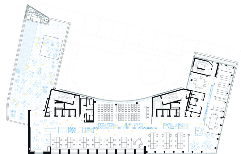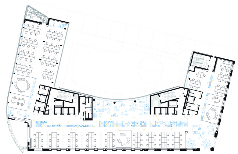 A thick architectural edge designed along the traditional working stations has been conceived to host a complex program of functions. Common office services such as copy centres, telephone rooms, print stations are mixed along this edge, called the spine, with relax rooms, smart corners, meditation rooms, coffee corners, community indoor gardens, book crossing libraries, exhibition areas, mini kitchens and common refrigerators.