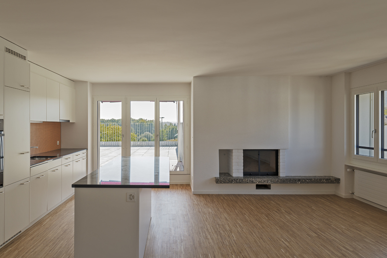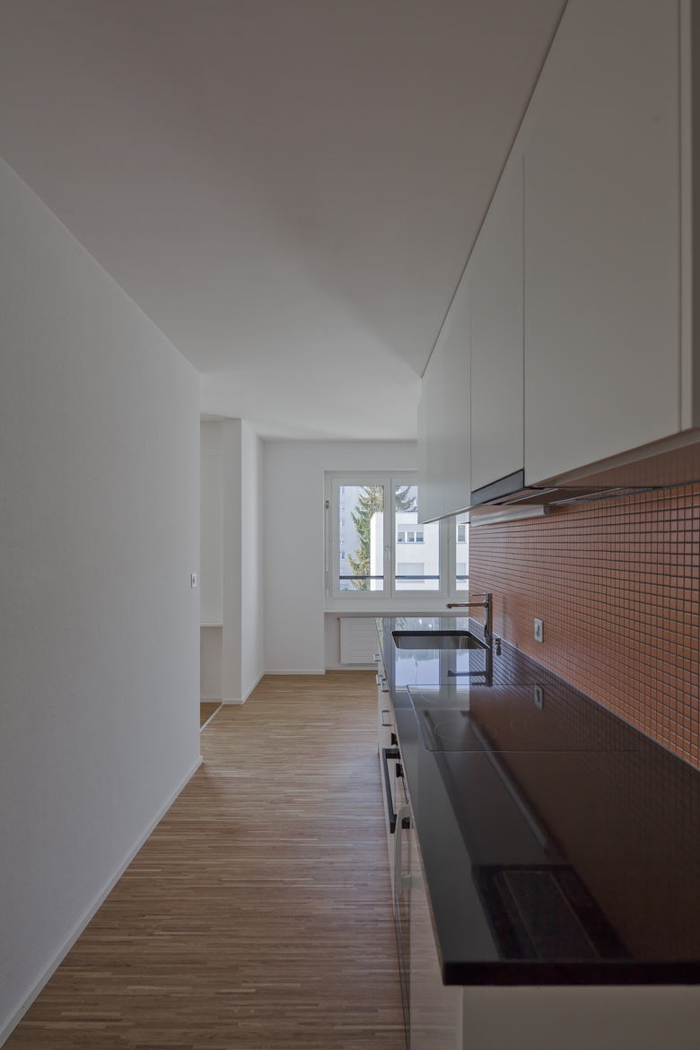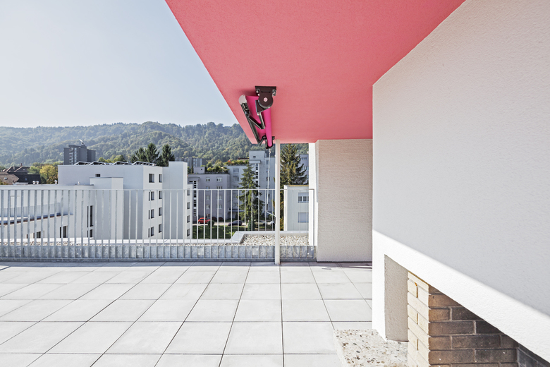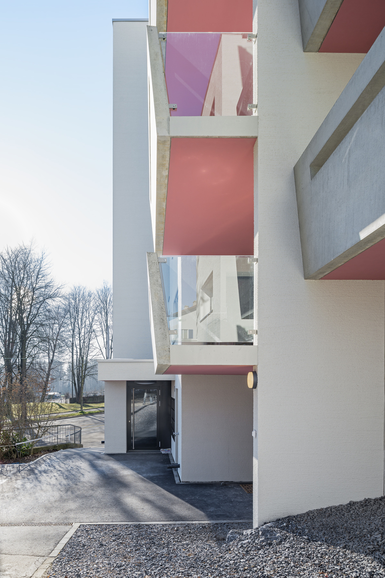 Mit wenigen Eingriffen werden die bestehenden Strukturen gestärkt und das Erscheinungsbild belebt, ohne den Charakter der Überbauung neu zu erfinden. Im Zuge der Grundrissoptimierung werden zwei kleine Wohnungen zu einer grossen Wohnung zusammengelegt. Die wesentliche Grundstruktur soll erhalten bleiben. Der neue Wohn-Essbereich erstreckt sich über die ganze Tiefe des Hauses. Offene Nischen und Verzweigungen erzeugen ein grosszügiges Raumerlebnis. Mit der Erweiterung der Balkone wird der bisher sehr intime Aussenraum um einen öffentlichen Teil ergänzt. Eine erfrischende Farbigkeit lässt den neuen Aussenraum nach innen wirken. Der Ausblick und die Weitsicht werden neu inszeniert.