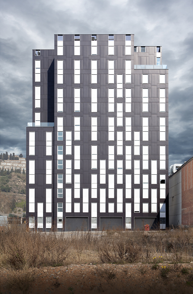 Se propone un edificio de planta plegada en L, de doce pisos de altura, que se organiza a partir de dos corredores perpendiculares que disponen de luz y vistas en sus extremos. Estos espacios de circulación dan acceso a las viviendas y facilitan el registro de todos los servicios e instalaciones sin necesidad de acceder al interior de las mismas. El núcleo de escaleras y ascensores, en posición central en el cruce de los dos corredores, ocupa el único espacio de la planta que no dispone de fachada. El pliegue del edificio forma un patio de acceso orientado a sur.