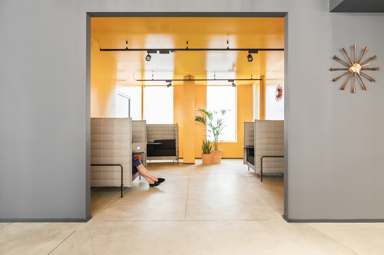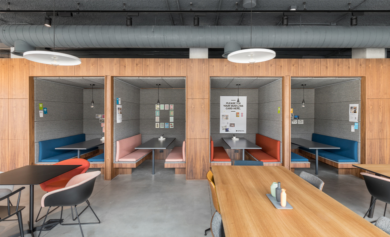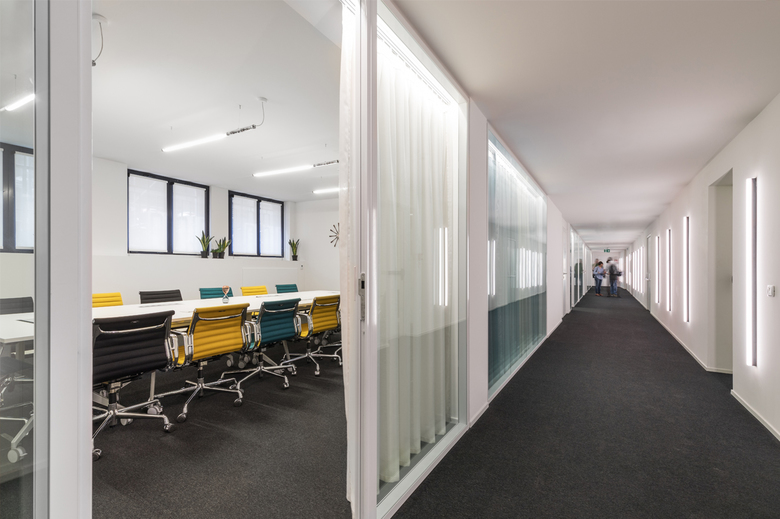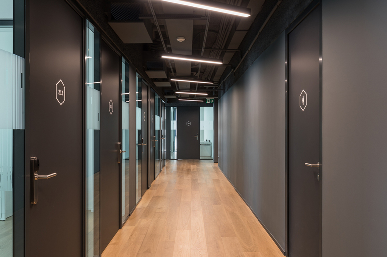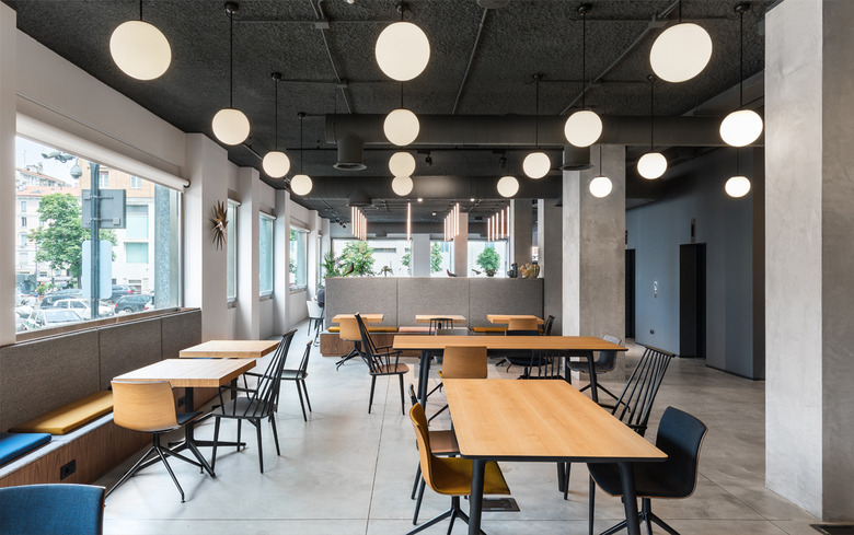 The building faces the Bastioni and turns towards Piazza XXV Aprile, one of the most interesting examples of urban renovation in Milan. Spaces creates a community environment that offers multiple spatial solutions to create networks. Designing this ecosystem is like designing a small town or a large collective house. Each space is a useful place for the community that allows multiple exchanges , from formal ones to informal and spontaneous ones. Even a hidden corner, if well designed, can turn into a great place of work and unexpected meeting. The strength of the project relies on combining the informal model of this kind of spaces with the sensible aesthetic and rigorousness of the city, of its buildings and its entrances. The project focuses on the potential of a flexible and innovative space and at the same time on the quality of the materials. The project picks up from a first generation of co-working, emphasizing exclusively the informal and playful image of the spaces, that were built as an only alternative to the excessively corporate dimension characterizing the office projects of the ‘international style’. Spaces Milan tries to overcome this dichotomy taking advantage of the potentialities of both scales. The common spaces have been conceived with an aesthetic rigor and attention to details and materials similar to that of the interior design project instead of a collective environment. At the ground floor a great attention was paid to the lighting design. Seen from outside, lights and lamps are perceived as iridescent architectures, flying carpets that light up the Milanese nights. Colours and materials define in a subtle way the character of each space: from the bright and playful colours of the areas near the entrance to the warm walnut wood of the cafeteria, from the soft palette of the working area and of the booths to the neutral colours of the quiet area. At the office floors , the abstract materiality of glass walls framed with black steel is opposed to the warm oak of the flooring. Along each corridor, the lights, hanged with a 30 degree inclination, replace the false ceiling and emphasize the sense of movement. Thanks to a series of folding walls, the sequence of meeting rooms of the basement easily becomes a unique, continuous event space.