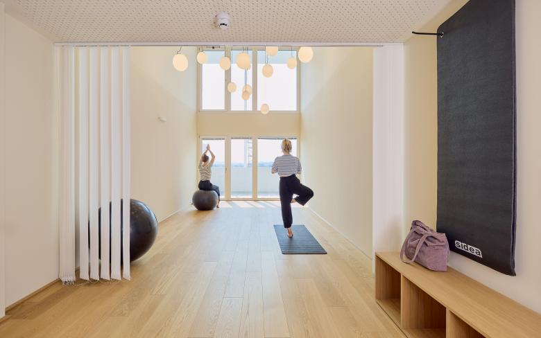 Im Erdgeschoß betritt man den Taborama west- oder ost-seitig durch ein großzügiges Atrium. Direkt daran angeschlossen ist der Fitnessraum sowie der große Fahrradraum. Die Erschließungszonen werden in jedem Geschoß durch Tageslicht und Blickbeziehungen nach außen zu einem positiven Raumerlebnis aufgewertet.