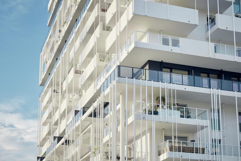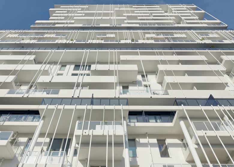 Das horizontal gegliederte Hochhaus bildet in Kooperation mit seiner unmittelbaren Umgebung eine geschützte Hofbucht. Die dunkel gestalteten Zäsurgeschoße mit großzügiger Raumhöhe strukturieren den Baukörper und sind durch eine umlaufende Balkonzone gekennzeichnet. An die weiteren Geschoße schließen unterschiedlich ausformulierte Balkone an die Wohnbereiche an und gliedern das große Volumen in überschaubare soziale Einheiten.