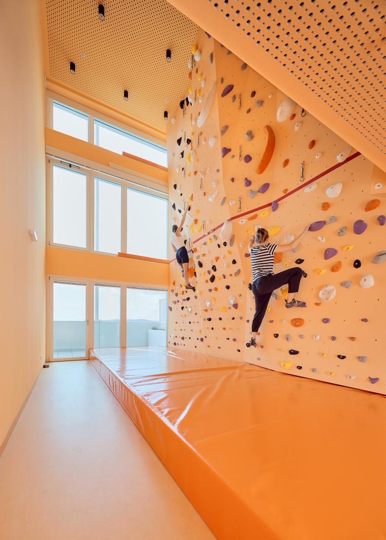 Am Dach steht allen Bewohner*innen ein Pool zur Verfügung. Weitere, meist mehrgeschossige Gemeinschaftsräume sind über die gesamte Höhe des Taborama verteilt und stärken das gemeinschaftliche Wohnerlebnis und die Nachbarschaft. In den oberen drei Geschoßen befindet sich ein Boulderraum, gefolgt von einem zweigschossigen Yoga-, bzw. Sportraum, einer Bibliothek, die von den Bewohner*innen selbst gefüllt wird, einem Bastel- und Malraum, indem von den Bewohnern organisierte Mal-Workshops stattfinden, einem Tischtennisraum sowie weiteren Räumen, die Nutzungsoffen gestaltet sind.