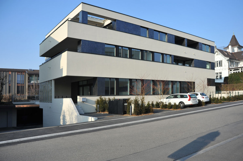 Das Haus aus den sechziger Jahren war ursprünglich ein Wohnhaus mit Gewerbe im Erdgeschoss. In den achtziger Jahren wurde im Garten ein Schwimmbadpavillon mit Fertigbauteilen angebaut. Jetzt wurde es in ein reines Wohngebäude mit sieben räumlich sehr unterschiedlichen Wohnungen umgebaut. Im ehemaligen Gewerbeteil im Erdgeschoss beträgt die Raumhöhe der neuen Wohnungen annähernd vier Meter, die Obergeschosse haben ihre konventionellen Raumhöhen beibehalten.
