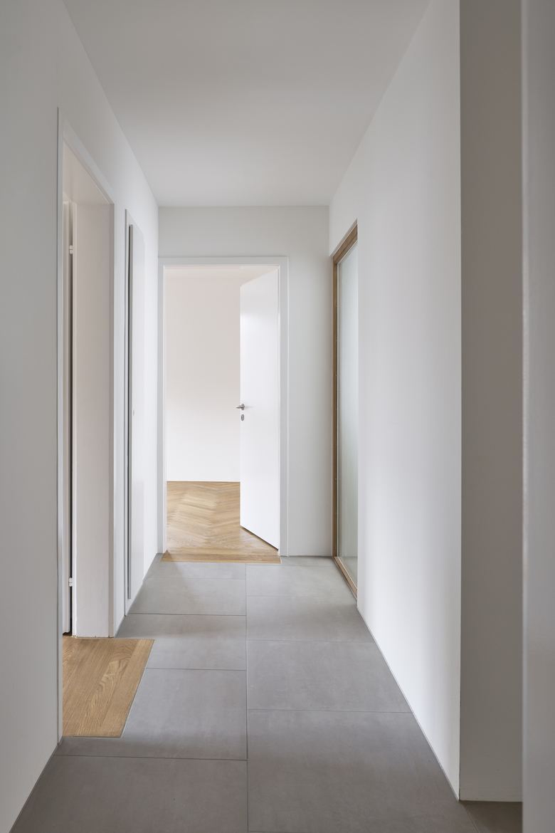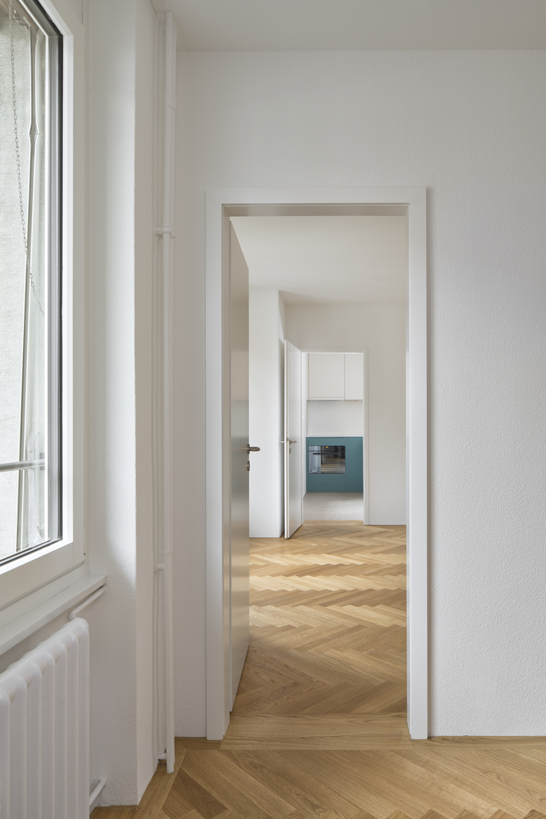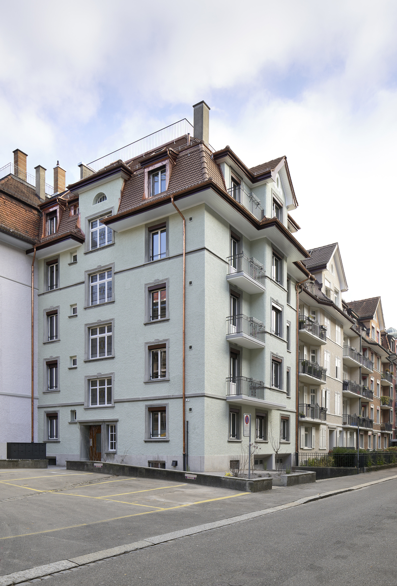 Wie wird eine Wohnung grösser, ohne anzubauen? Die Grundrisse der kleinen Wohnungen eines Mehrfamilienhauses im Zürcher Seefeld wurden geöffnet, so dass Küchen und Gang zu einem Koch- und Essraum zusammenfliessen. Die Folge: Ein neues Zimmer entstand. Und die BewohnerInnen im ortstypischen Wohnhaus aus den 1920er-Jahren gewinnen neue Ansichten: Indem die Türöffnungen präziser gesetzt wurden, dringt mehr Licht ins Wohnungsinnere, und der Blick kann ungehindert von Raum zu Raum oder nach draussen wandern. Die Wohnungen wirken grosszügiger, und sie sind heller. Weitere Eingriffe wie der Ausbau des Estrichs zur Wohnung oder die Erneuerung von Haustechnik, Lift und Schallschutz wurden sehr sorgfältig vorgenommen, um den Charme des Hauses bewahren zu können.