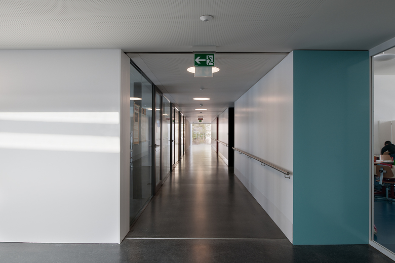 Im Inneren bietet der Neubau Raum für grössere Klassenzimmer und für einen Mehrzweckraum. Die Trennung zwischen Schul- und Gruppenräumen und den Wohn- und Therapietrakten wurde eindeutig, und es entstand zugleich ein offener Bezug zu den drei bestehenden Gebäuden. Besonderen Wert legte man auf die Untergeschosse, die dank der neuen Bandfenster vollwertig nutzbar sind.