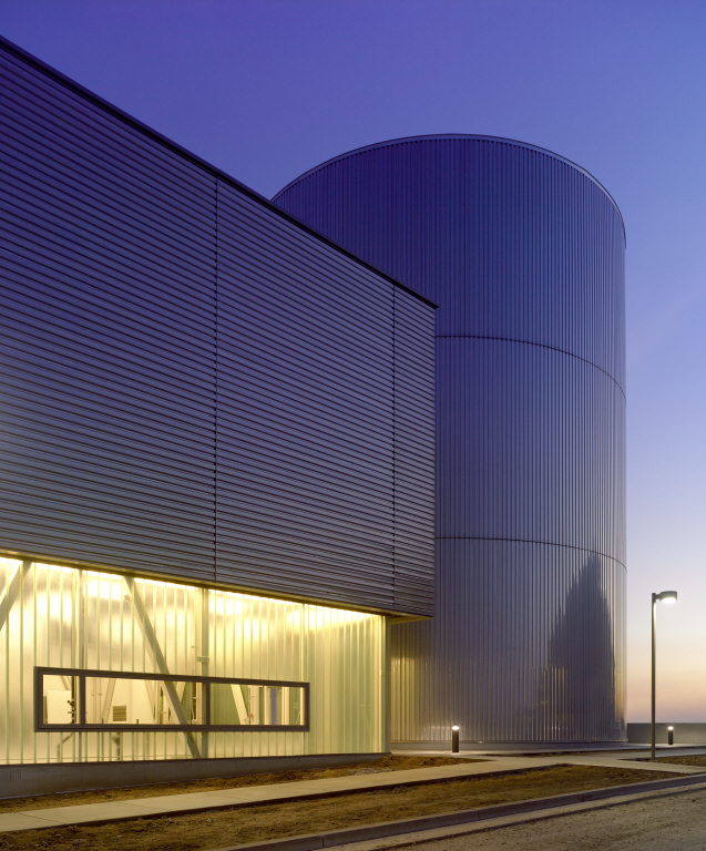 This complex is part of the first phase of a new university campus for the state of California. In addition to providing power for the university’s first-phase buildings, the plant also plays a key role in achieving the ambitious sustainable design goals outlined by the Board of Regents—20 percent lower than any existing campus in the system and a campus-wide Silver LEED™ rating. The exterior walls of the plant and tank are sheathed in an outer layer of corrugated metal panels similar to the ubiquitous grain silos, farm sheds, semi-trucks, and freight cars found in the valley. The finish of the stainless steel panels captures and reflects the entire spectrum of the brilliant Central Valley summer sun.