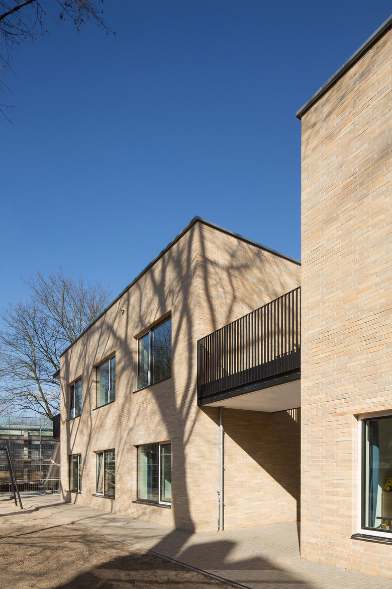 Die Zuwegung zum Kindergarten erfolgt, geschützt vom Straßenverkehr, nördlich der vorhandenen Bäume über eine breite, befestigte Fläche, die nach Norden durch eine Außenmauer des Kindergartenfreigeländes begrenzt wird. Diese befestigte Fläche kann für Flohmärkte und andere Außenveranstaltungen genutzt werden. Die Spiel- und Freiflächen des Kindergartens orientieren sich nach Norden und Osten. Ein öffentlicher Spielplatz wurde zwischen Kindergarten und Schule zentral angeordnet und kann so von beiden Einrichtungen mitgenutzt werden.