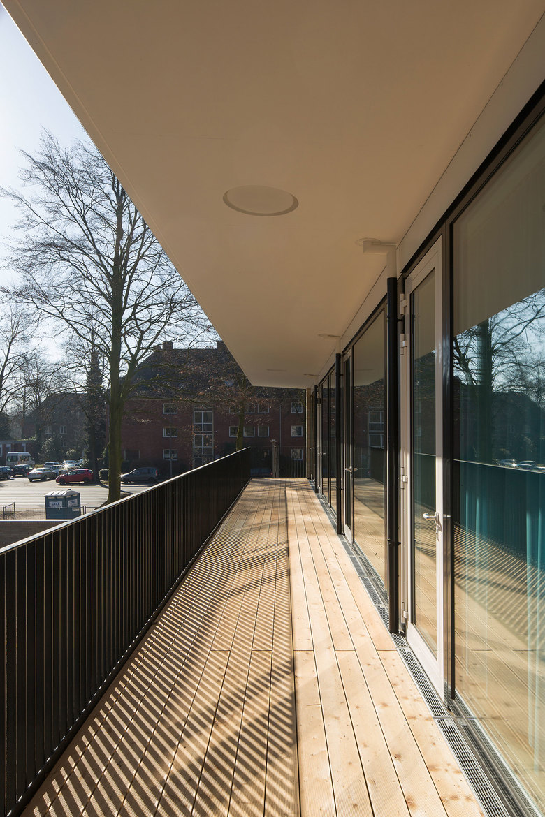 Die Erschließung mit Treppenanlage und Aufzug liegt zwischen den Gruppenbereichen und den allgemeinen Räumen wie Leitungsbüro, Küche und Mehrzweckraum. Eine Fluraufweitung im Bereich der Küche bietet die Möglichkeit zu einem Elterncafé und schafft einen großzügigen Eingangsbereich.