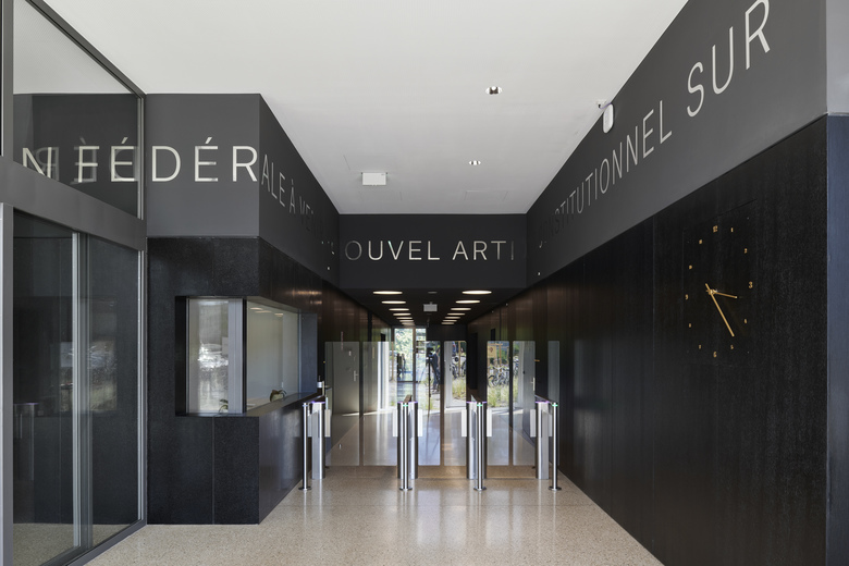 Die Fassade webt in ihren Proportionen, der Anordnung der Öffnungen sowie ihrer Materialität den Ausdruck des bestehenden Gebäudes in zeitgemässer Weise weiter. Grosse vorgefertige Betonelemente unterstreichen den eindrucksvollen Charakter des Baukörpers.