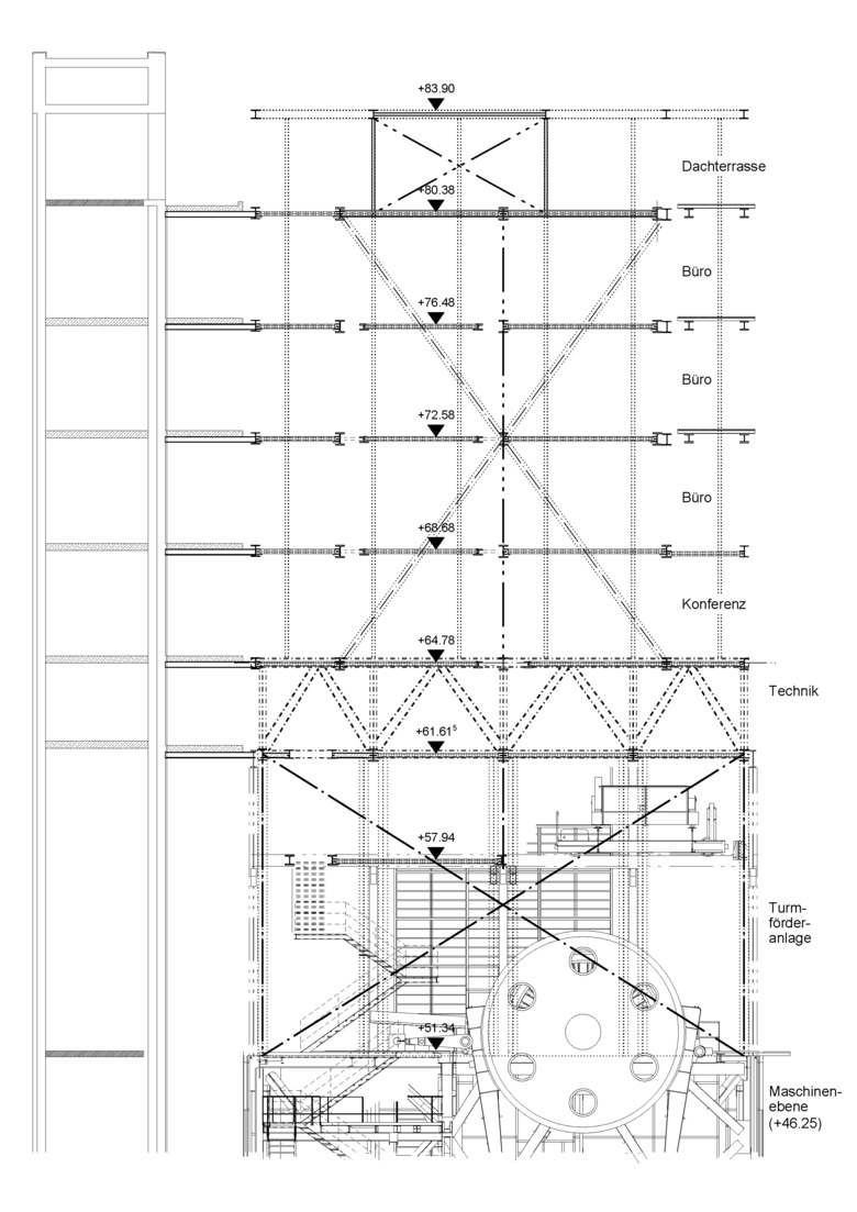 Nur hierdurch gelang die für die Realisierung des Projektes unabdingbare Einhaltung der ursprünglichen maximalen Bemessungslasten, welche der Dimensionierung der Eckstützen des bestehenden Förderturmes zu Grunde lagen.
