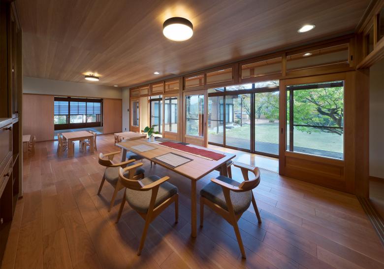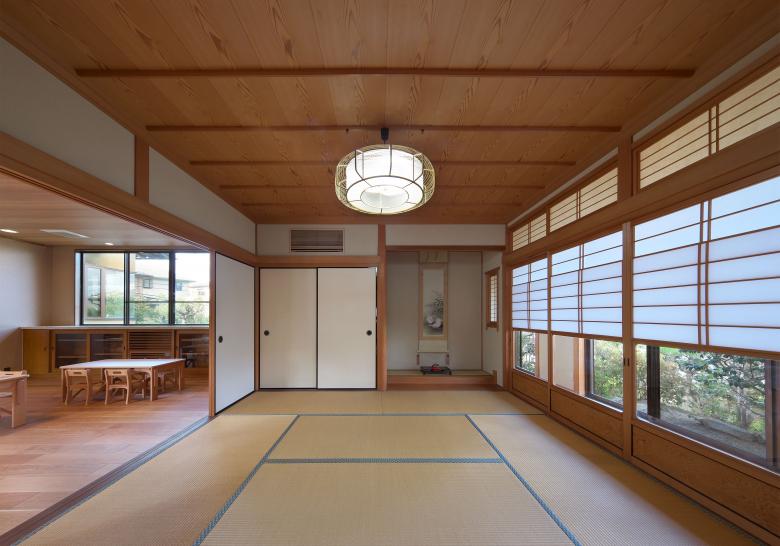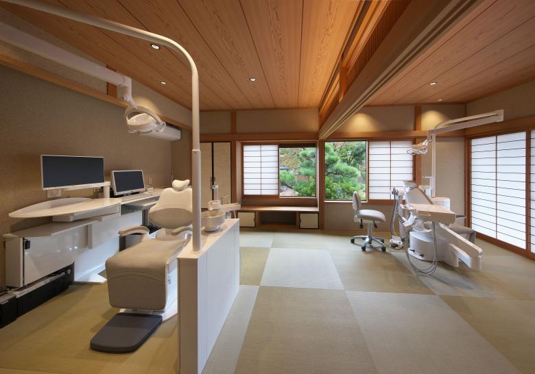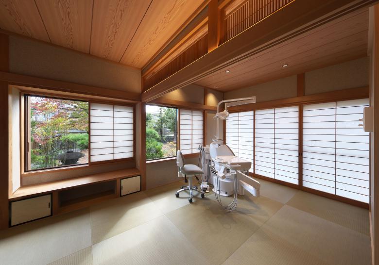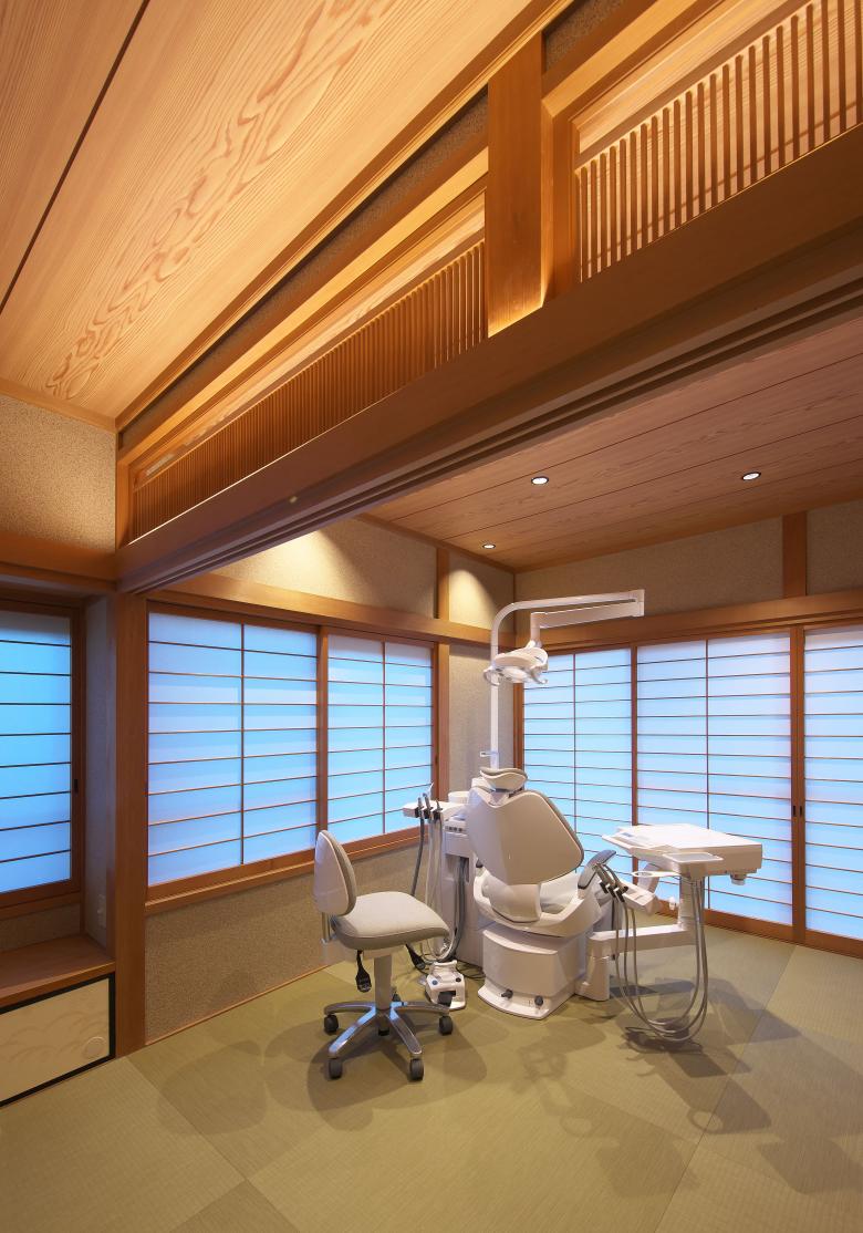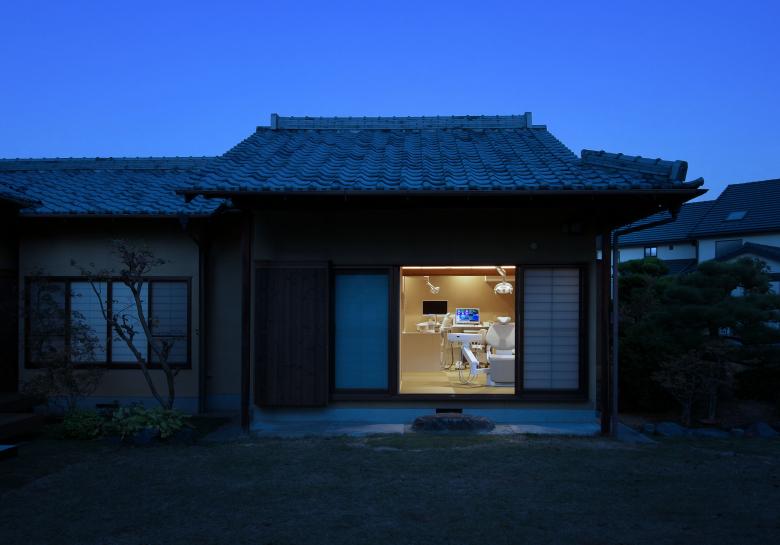 東大阪で小児歯科を営む歯科医師ご夫妻。奥さまによる新しい試みとして、「小児歯科+小児科+保育園+助産院」の複合施設をつくることとなり、奈良県の閑静な住宅街に大きな庭がある日本家屋を購入された。水回りの配置変更と歯科医院にX線室を増設する以外は、平面的な変更をせずに、建物のもともとの魅力を活かし、修復に近い最低限の改装にて、機能を充足させ快適な環境をつくることが求められた。既存の柱梁が映えるように、聚楽壁の汚れを消す重ね塗りの材料の色を低彩度に変更して、壁の主張を抑えた。玄関部には、通常和室壁には使用しない、基礎の化粧材料を使い、新しい和のイメージを提案した。歯科医院の診療部分も和室に機材を持ち込んだだけのような雰囲気にするために、畳のようなビニル床タイルを貼り、欄間に間接照明を仕込むだけの操作を行った。大きな庭と家のように安心感がある建物の中を子供たちが行き来して遊び、後の思い出になるような場所になればと思う。