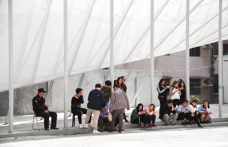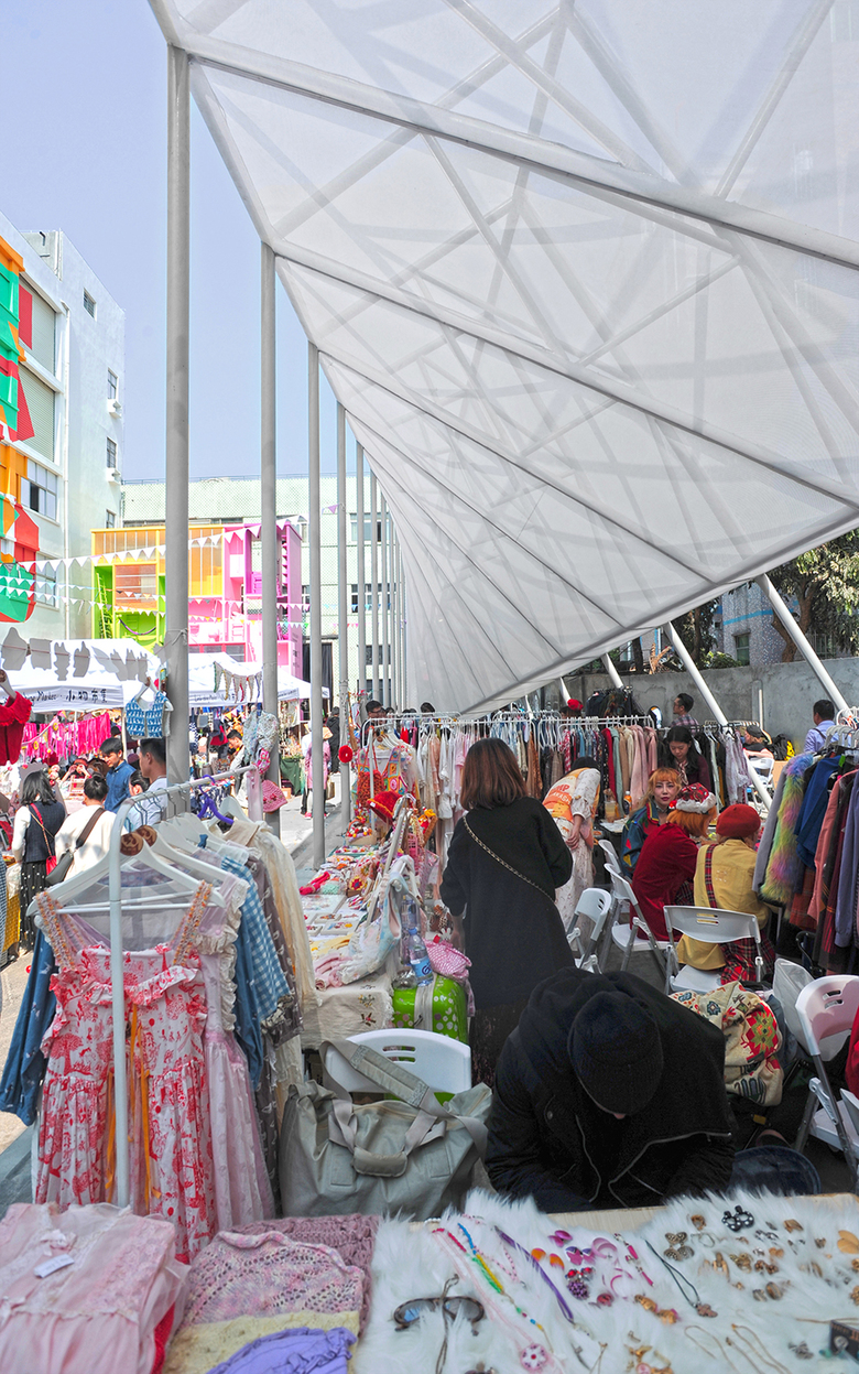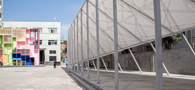 The site of the plaza produces an urban edge along the village wall that is ripe for programmatic activation. As a structure that adopts the wall as datum, we proposed a linear organization, broadly informed by typologies whose figural demeanor have the power to activate an edge condition of some length: a stoa, arcade, colonnade, loggia. With each bay composed of a customized section, the structure was originally conceived as scaffolding, but the local material and labor economies dictated a last-minute change-order to adopt standard tube steel extrusions—which ironically was the key mechanism to enable a strategy of permanence.