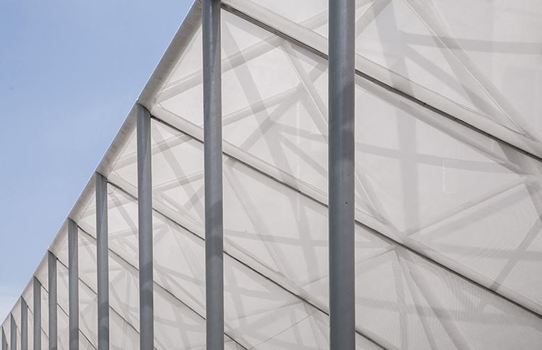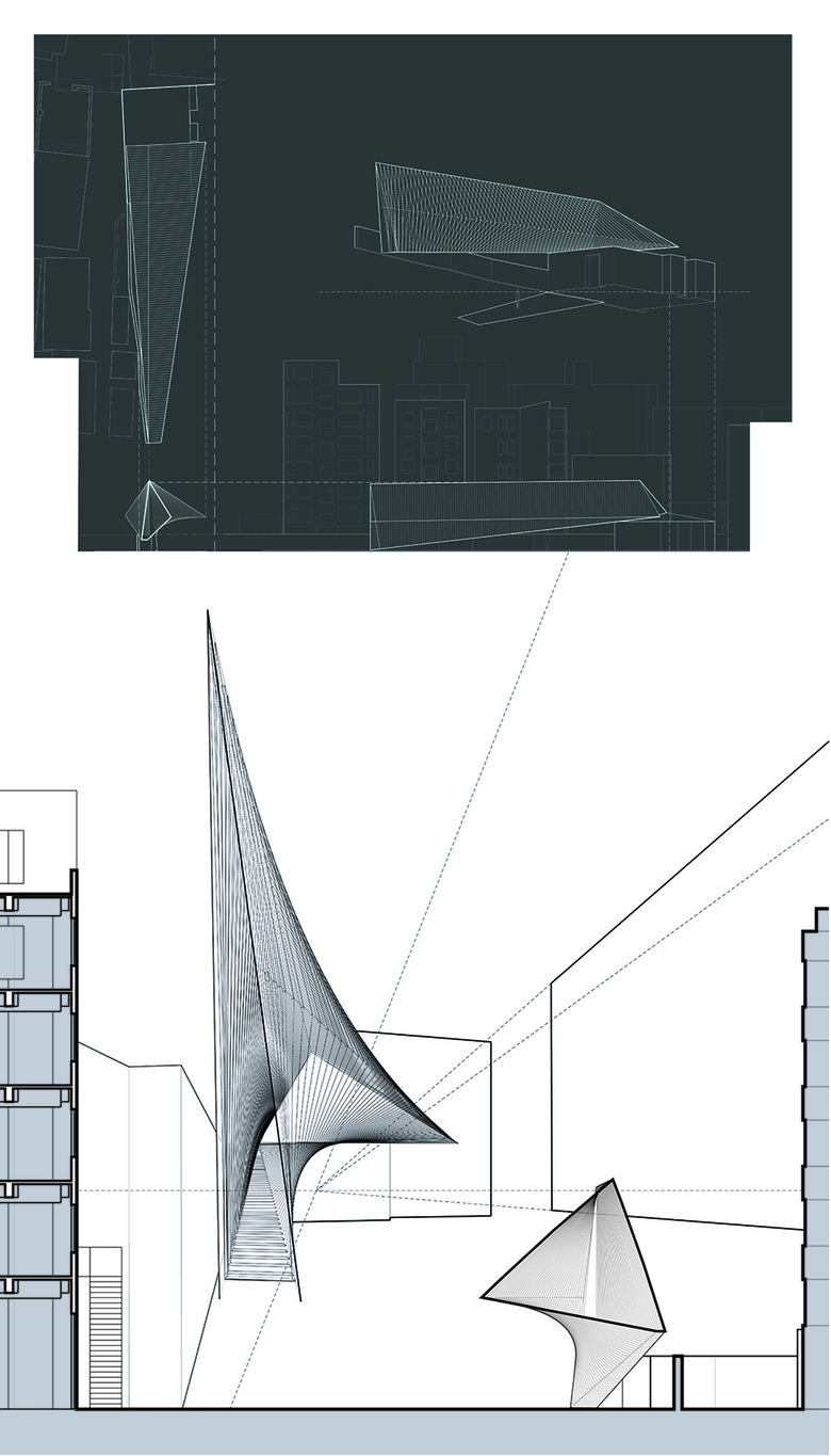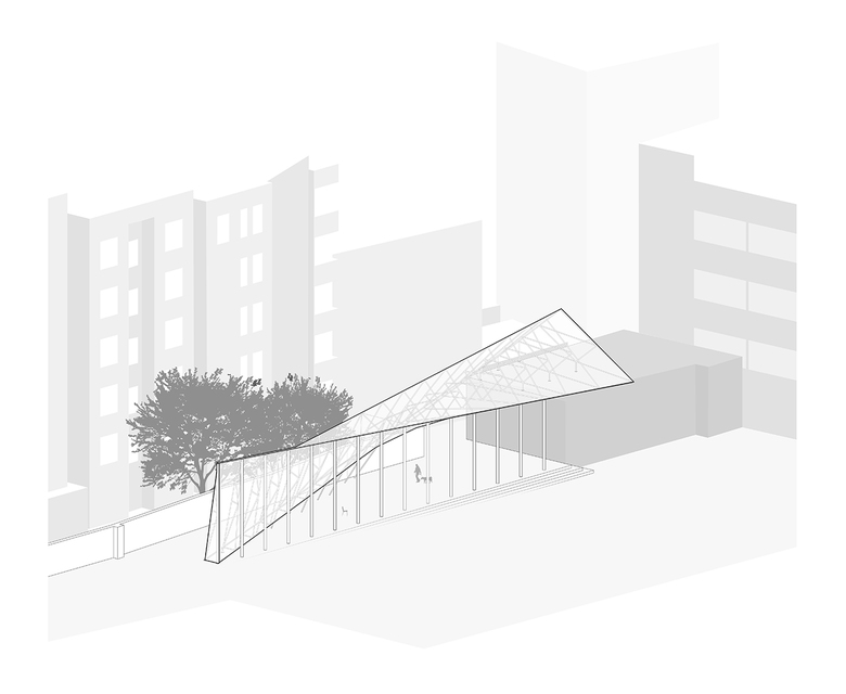 The structure is clothed in a perforated skin, whose figure is torqued in relation to the very skeleton that gives shape to its body. Meeting the ground on the northern end as a support, the volume of the figure reduces in girth at every bay, eventually compacting itself to a thin canopy towards the south which is supported by an existing building. Not reducible to typological description, the piece oscillates in shape, function, and in urban position, allowing its hybrid behavior. At once compositionally legible through the regimented syncopation of its structure as an urban colonnade, and at the same time the shrink-wrapping of its structure is legible as a colossal figure in the urban landscape, something that gives monumental presence to an urban void. The new structure gives a face to the urban room—a space that has for decades served as a residue for parking and detritus—and for the first time in history, also offers protection from the dynamic environment, a place of respite and leisure for the very community it serves, and a figure that occupies the collective imagination.