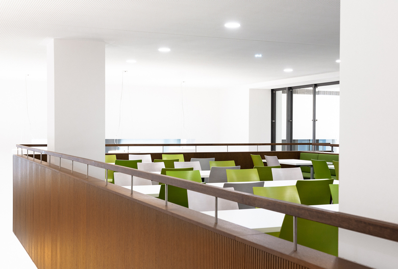 Das neue Farbkonzept in Schwarz-Weiß mit Farbakzenten in unterschiedlichen Grüntönen sorgt für einen frischen und regenerierenden Erholungseffekt der hier verbrachten Pausen. Ein verbessertes Beleuchtungs- und Akustikkonzept schaffen ein warmes und wohltuendes Raumklima. Die in Holz verkleidete Galerie und Treppe nehmen Bezug auf die vorhandenen Holztüren und Fenster. Zur Verbesserung der Funktionalität wurde die Treppe versetzt. Dadurch wird die Aufteilung des Raumes und der Weg zu den oberen Essplätzen deutlicher. Das neue Mobiliar besteht aus weißem Corian® und sorgt für eine kommunikative und freundliche Kantinenatmosphäre