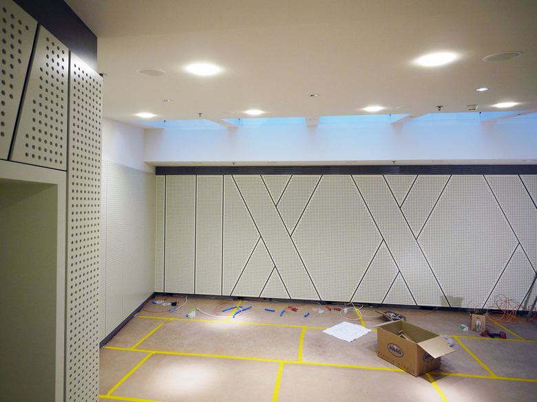 Die zum Oblicht sich auffaltende Gipsdecke und der umlaufende Akustikschirm geben dem Raum seinen unverwechselbaren Charakter. Das Konzept der Wandgestaltung zum vorgegebenen Raumnamen INDEX ist vom Zürcher Graphiker Ralph Schraivogel entwickelt worden.
