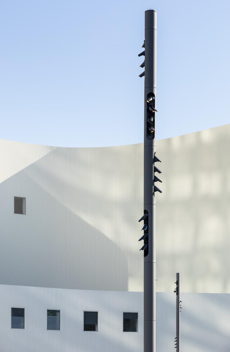 Hierfür wurde eine ganz neuartige Lichtstele entwickelt, die wie eine Bühnenleuchte im Freien fungiert und unterschiedlichste Lichtszenarien ermöglicht. Die Lichtstelen sind individuell ansteuerbar und können mit ihren schwenkbaren Einzelstrahlern punktgenau und präzise ausgerichtet werden. Das ermöglicht eine verlässliche Ausleuchtung zu jeder Tageszeit.