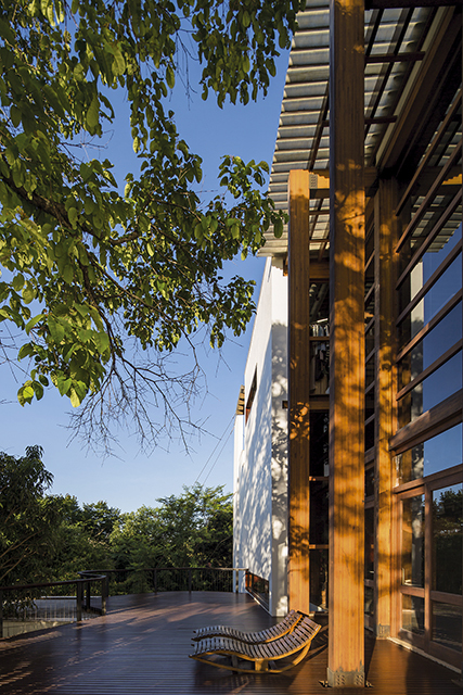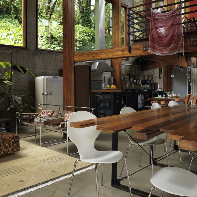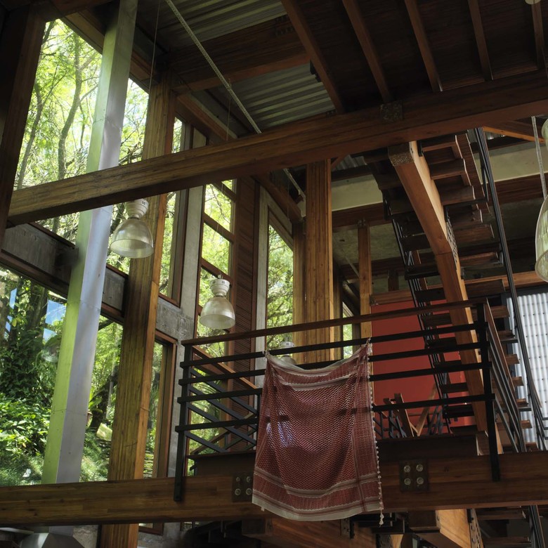 Residence built with mixed structure: glued laminated eucalyptus in the center, reinforced concrete on the perimeter. The two structures are mixed and create a certain excess of pilars througout the house. The central element is a 9m high stairway; whereas the rooms are located about the void. The furniture was designed by Casa Design Brasileiro.