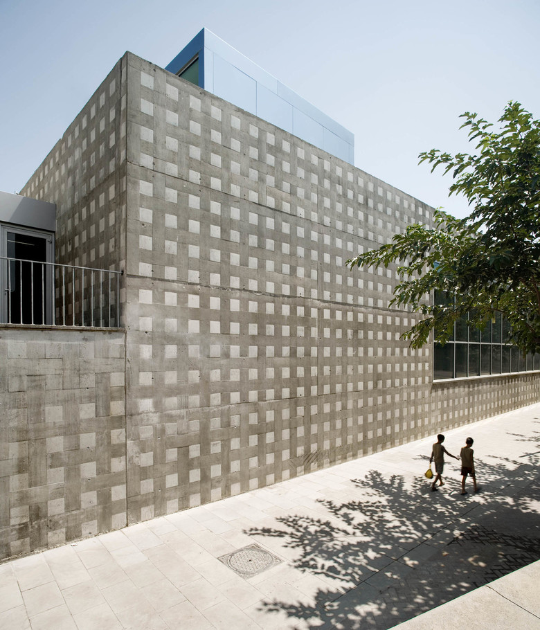 the new building is materially and formally austere. the façade is made from exposed in-situ concrete, giving a texture that is a homage to the start of the textile industry in catalonia in this area of the city. the texture has come from a specially combined formwork of timber planks of different characteristics.