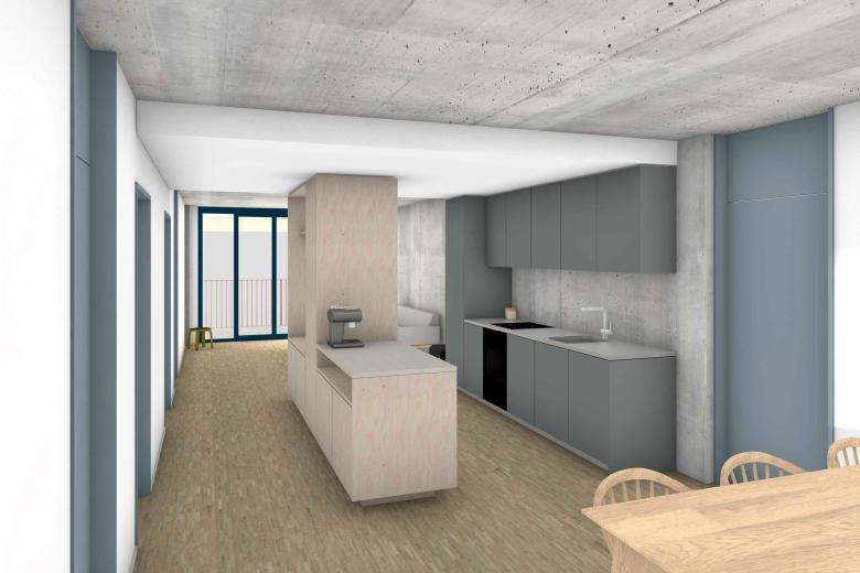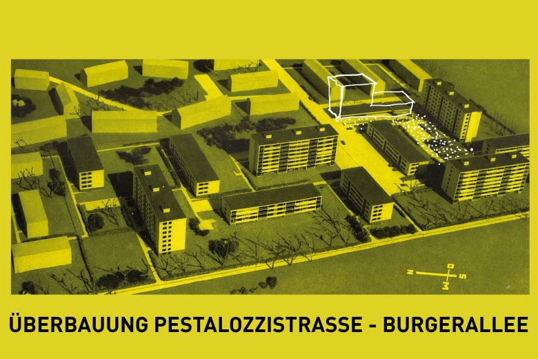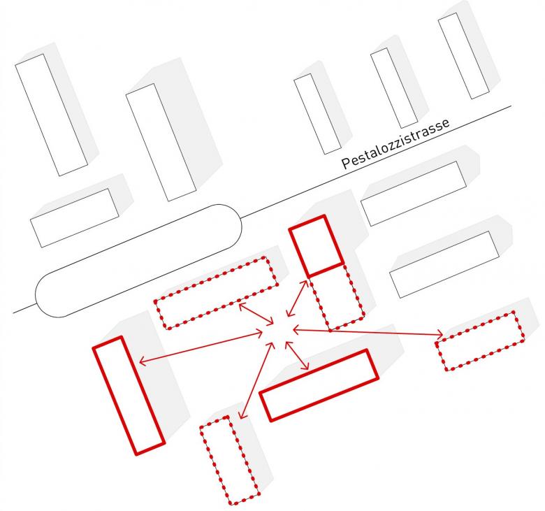 Der achtgeschossige Gebäudeteil an der Pestalozzistrasse markiert den Hauptzugang zur Siedlung, der neu über den Innenhof führt. Wo heute noch Parkplätze sind, entsteht ein neuer Aussenraum für alle. Das Erdgeschoss des Neubaus orientiert sich zum neuen Zugangsweg und zum gemeinsamen Hof. Eine flexible Gewerbefläche befindet sich direkt an der Pestalozzistrasse. Das neue Siedlungs-Bistrot belebt den Hof und kann mit dem angrenzenden Gemeinschaftsraum und der vorgesehenen kleinen Kita kombiniert werden.