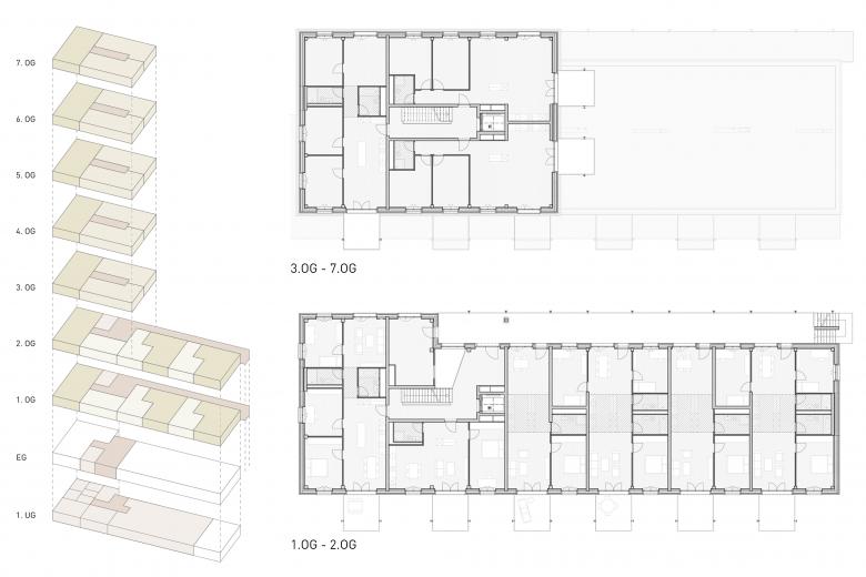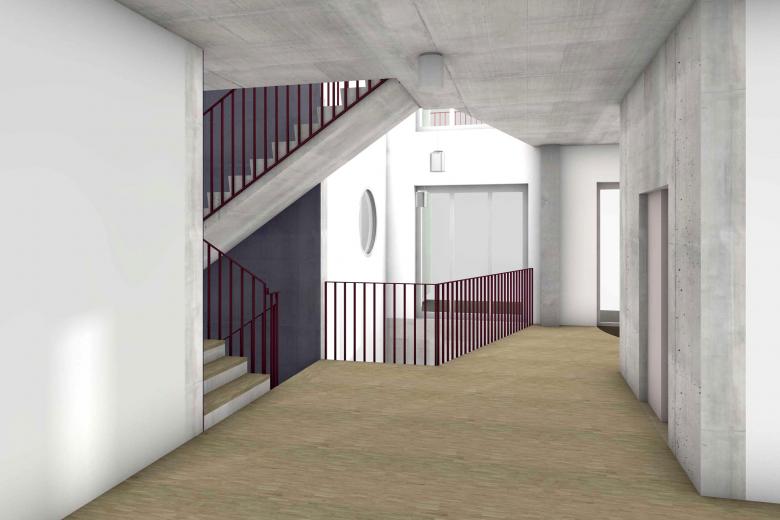 Die Erschliessung der Wohnungen ist ein Hybrid aus Laubengang und Punkterschliessung. Beim dreigeschossigen Gebäudeteil führt auf der Ostseite entlang dem Quartierweg ein Laubengang mit Aussentreppe zu den Wohnungen im 1. und 2. Obergeschoss. Die Wohnungen im achtgeschossigen Kopf werden durch ein Treppenhaus mit Lift erschlossen, welches jeweils auch zum Laubengang führt. Es entsteht eine spannende Erschliessungsfigur, welche im Erdgeschoss hofseitig an den neuen Siedlungszugang und rückseitig an den Quartierweg angebunden ist. Vom Laubengang her sind auch drei Ateliers zugänglich, welche als Joker- oder Ferienzimmer von allen Siedlungsbewohner*innen dazu gemietet werden können.