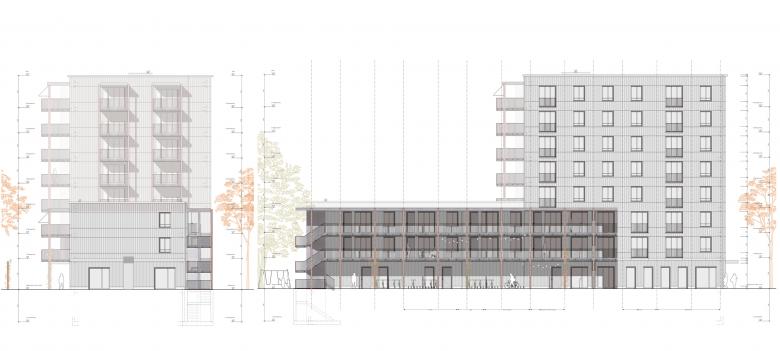 Ein acht- und dreigeschossiger Neubau in Hybridbauweise erweitert die bestehende Genossenschaftssiedlung aus den 1970er-Jahren mit 27 zusätzlichen Wohnungen. Im Erdgeschoss entstehen Gemeinschafts- und Gewerbeflächen und im Hof anstelle des heutigen Parkplatzes vielfältige Aussenräume für alle Bewohner*innen.