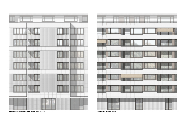 Das Projekt besteht im Wesentlichen aus einem markanten Gebäude entlang dem Letzigraben, welches im Dreiklang mit den Bauten von A. H. Steiner, den beiden Hochhäusern und den Wohnbauten an der Brahmsstrasse, die Grünanlage Heiligfeld neu aufspannt. Alle Wohnungen profitieren von der attraktiven, grossräumigen Parkanlage wie auch vom durchgrünten Letzigraben, der mit seinen doppelten Baumreihen wie ein Parkway durchs Quartier führt. Eine einfache, rhythmische Gliederung des Baukörpers schafft attraktive Gebäudezugänge und formuliert einen öffentlichen Grünraum unter Bäumen. Im Erdgeschoss sind nebst den grosszügigen Eingangshallen die Geschäftsstelle der SGE, aber auch Waschküchen, Veloräume und Ateliers untergebracht. Ein breiter Durchgang führt vom Letzigraben in die Parkanlage. Dort bilden die Pavillions der Kindertagesstätte und des Gemeinschaftsraums zusammen mit dem bestehenden Kindergarten attraktive, räumliche Bezüge.