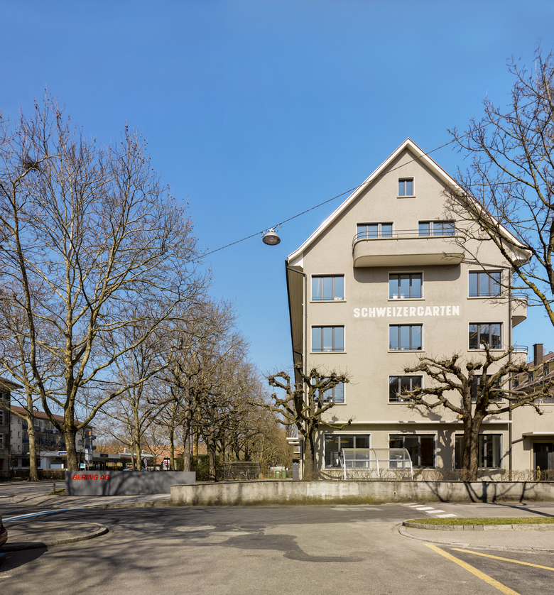 Das denkmalgeschützte Gebäude aus dem Jahre 1937 bildet der südliche Abschluss der Häuserzeile entlang der Papiermühlestrasse. Die Gibelfassade prägt den öffentlichen Raum Richtung Rosengarten. Ursprünglich als Wohnhaus mit Restaurant erstellt, wurden daraus später das Hotel und Restaurant Schweizergarten. Ab den frühen Achtzigerjahren des letzten Jahrhunderts werden die Räumlichkeiten als Büros genutzt.