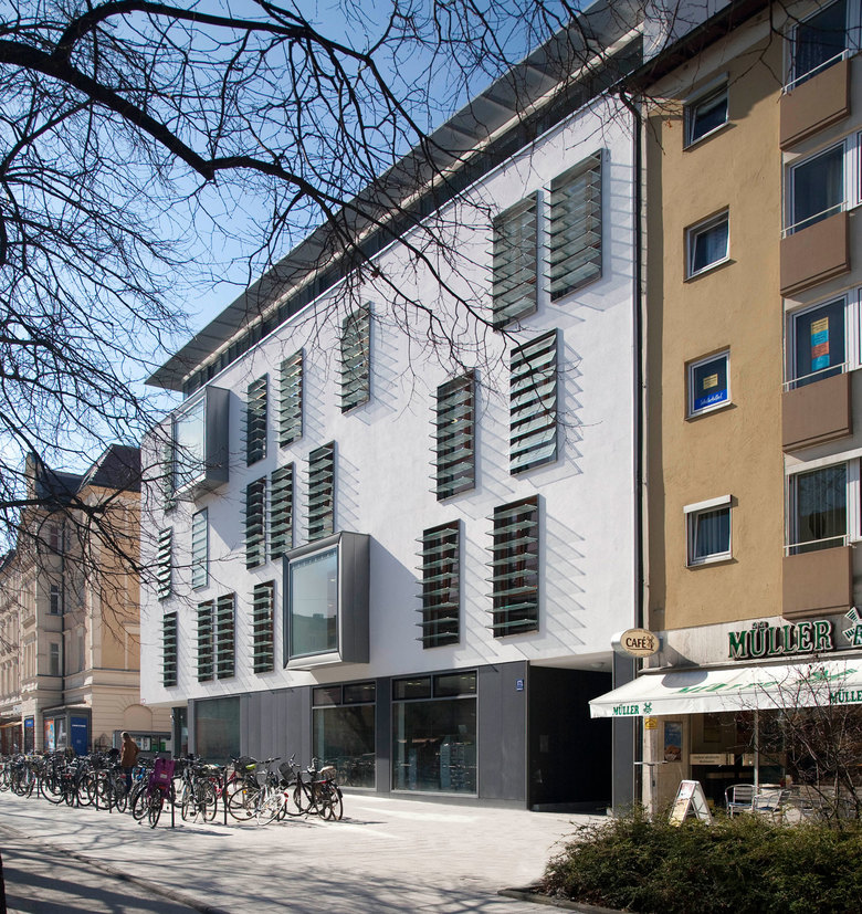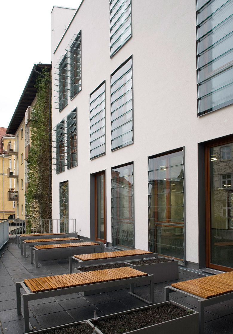Die Lamellenfenster des Neubaus berücksichtigen sowohl energetische als auch schallschutztechnische Aspekte in einer ungewöhnlichen Konstruktion: Die Holzfenster innen und die kippbaren Glaslamellen außen mit dem dazwischen liegenden Blend- und Sonnenschutz bilden ein Kastenfenster. Auf eine mechanische Lüftungsanlage konnte verzichtet werden.