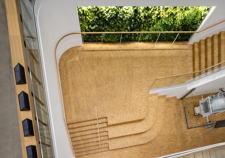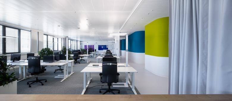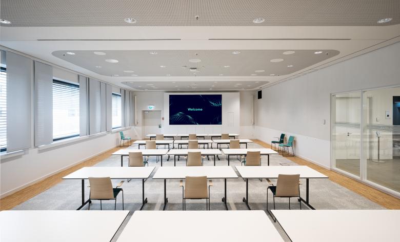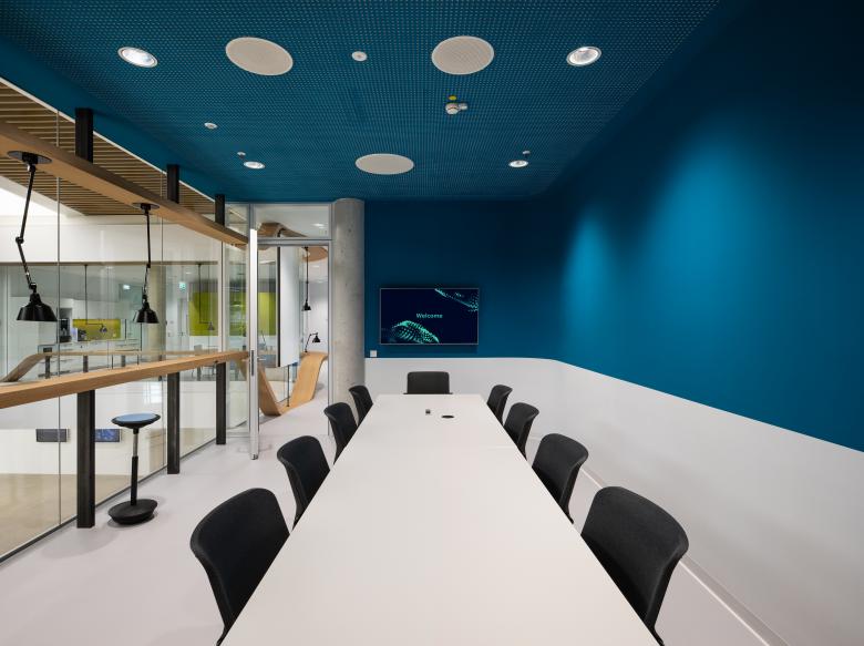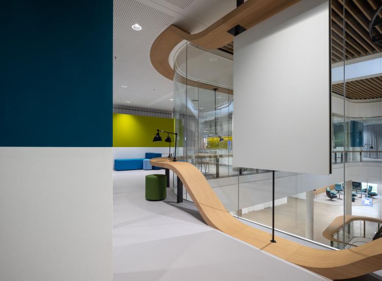Dreh- und Angelpunkt im Inneren des Gebäudes ist das zentrale Atrium, das von einem 17 Meter langen, freischwebenden Dach überspannt wird. Die offene Raumstruktur verbindet alle drei Geschosse miteinander und erleichtert die Orientierung. Ausstellungsflächen und exemplarische 3D-Modelle veranschaulichen die digitale Transformation der Siemens-Produktionswelten: Im Amberger Werk sind sämtliche Prozesse IT-optimiert und -gesteuert. Der Standort gilt als Paradebeispiel für die Automatisierung in der Produktion und wurde mehrfach ausgezeichnet. Der hohe Grad an Transparenz im Bereich der Besucherzonen wird spannende Einblicke in den digitalen Wandel der Arbeitswelt ermöglichen. Den hier tätigen Mitarbeitern von Siemens wird eine offene und kommunikative Umgebung mit einer Scrum-Zone für agilen Austausch geschaffen. So verweist der Neubau gleich in mehrfacher Hinsicht auf den eigenen Anspruch als innovatives Unternehmen.