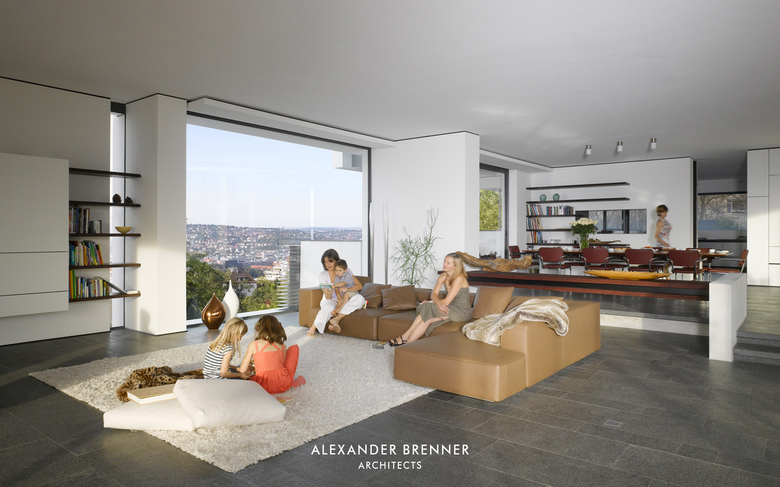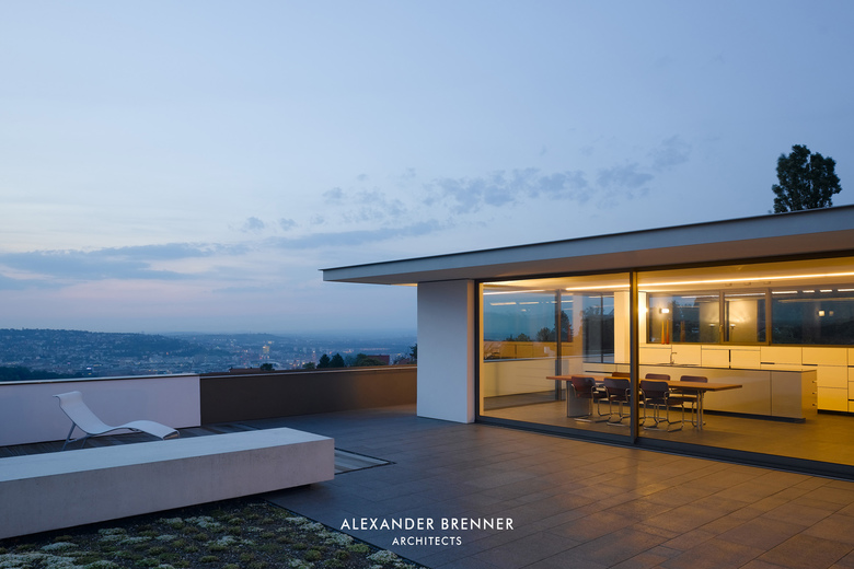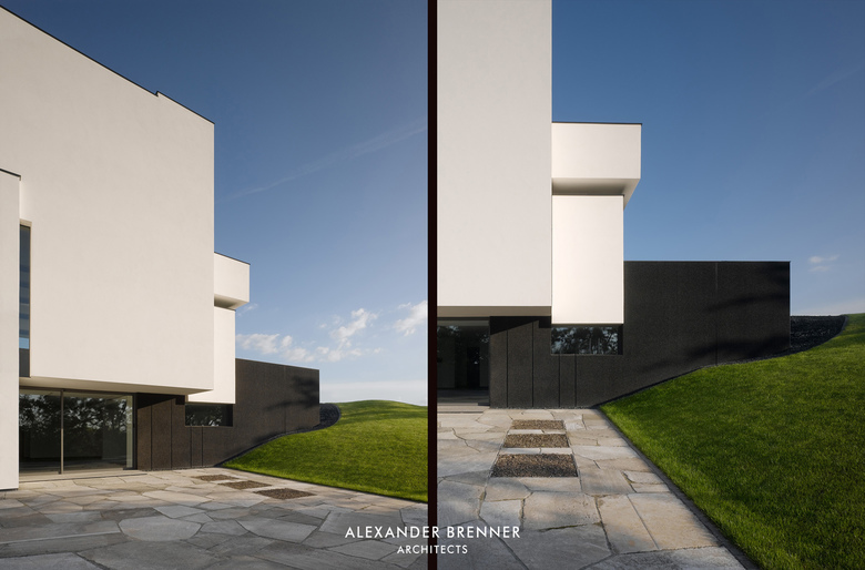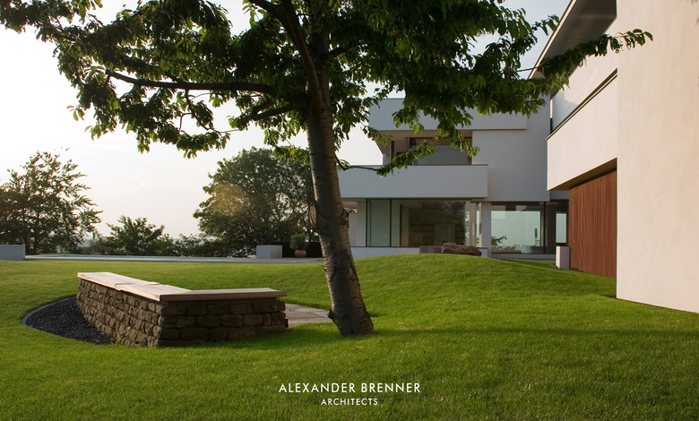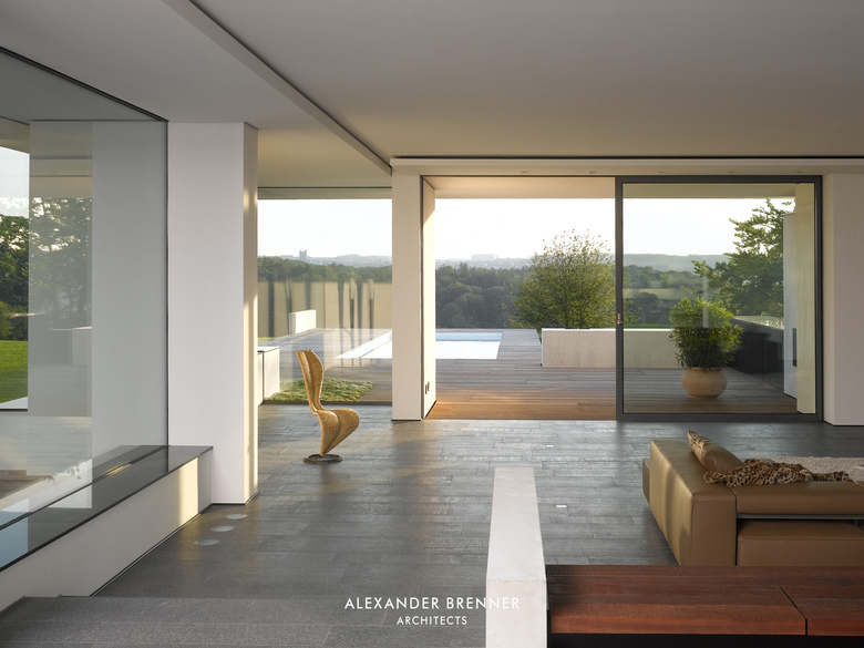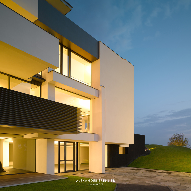 Nähert man sich auf der Zufahrtsstraße dem Bauwerk, erkennt man ein in die Tiefe geschichtetes Bild. Die Nordostseite des Hauses ist eine Addition weißer Kuben, von denen jeder aus der Nähe als einzelnes Bauteil erkennbar ist, während sie sich aus der Distanz zu einem Ganzen fügen. Betritt man das Haus von Nordosten über die zweigeschossige Eingangshalle, dann öffnet sich gegenüber die raumhohe Verglasung nach Südwesten zum Garten hin. Über den vorgelagerten Pool blickt man übers Tal und auf die gegenüber liegenden Hänge. In der Halle ist – wie im ganzen Haus – ein Wechselspiel von offenen und geschlossenen Räumen zwischen transparenten Glasflächen und schützenden Mauern erlebbar. Dies erfüllt einerseits die Bedürfnisse der Bewohner nach Geborgenheit und andererseits nach Offenheit und Verbundenheit mit dem umgebenden Natur- und Landschaftsraum. Bei Bedarf kann das Haus ohne größere bauliche Maßnahmen in unterschiedlich große Einheiten aufgeteilt werden und bietet so seinen Bewohnern größtmögliche Flexibilität und eine adäquate Wohnform für jede Lebens- und Familiensituation. Diese Generationenvilla interpretiert den alten Traum vom wachsenden und schrumpfenden Haus innerhalb einer Gebäudehülle neu und auf nachhaltige Weise. Durch die Südwest-Ausrichtung des Hauses, die großflächige Verglasung und die dunklen Böden werden maximale passive solare Gewinne erzielt. Eine großflächige Solaranlage auf dem Dach sowie eine Erdwärmepumpe sind weitere Bestandteile des Energiekonzepts.
