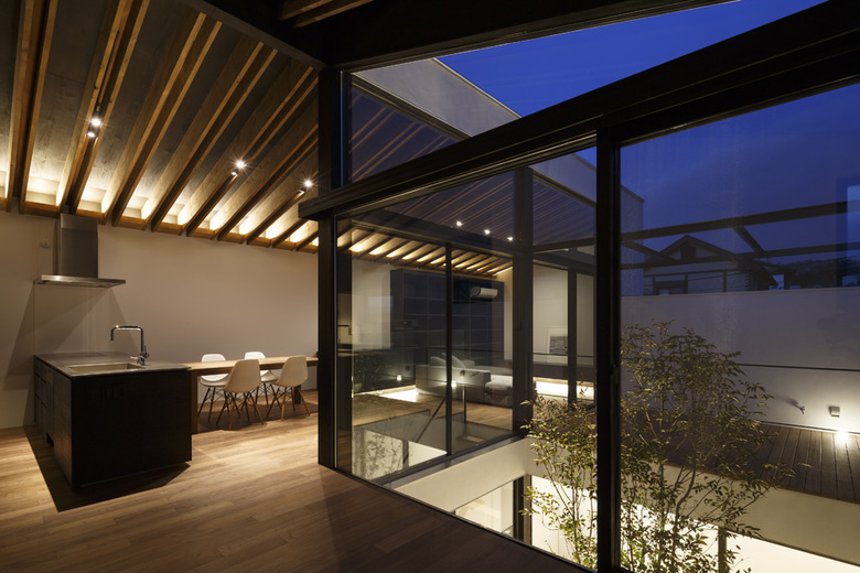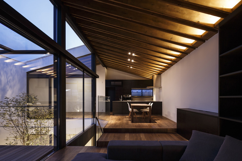 中庭のヒメシャラを眺めながら中央に配したストリップ階段を上ると、SPFで構成された特徴的な傾斜天井面が姿を現す。中庭から差し込む自然光がガラスに反射し天井面に端正な陰影をつくりだしている。リビング脇には趣味の本やレコードを収納する造作家具を設え、アウターリビングとの一体感が得られる大型引戸を配した。小上がりでダイニングキッチンを設けることで空間には舞台性が生まれ、リビングとの緩やかな棲み分けが生まれている。キッチン横には、読書や趣味などで自由に過ごせるエクストラ空間を用意し、各自が居場所を限定せず生活を堪能できる仕組みとした。夜には間接照明が天井面を照らし光のグラデーションをつくりだすことで昼とは異なる表情が生まれている。