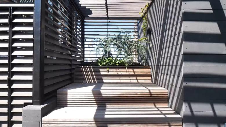 A glass elevator connects the floors with connective voids that allow for a fluid living environment. The highly recognizable climate envelope, whose spatial and performative properties serve as an adaptable perimeter of the building, is made from a lightweight steel frame and folding panels. This skin can be opened and closed with ease, and adds new exterior spaces in different, variable conditions.