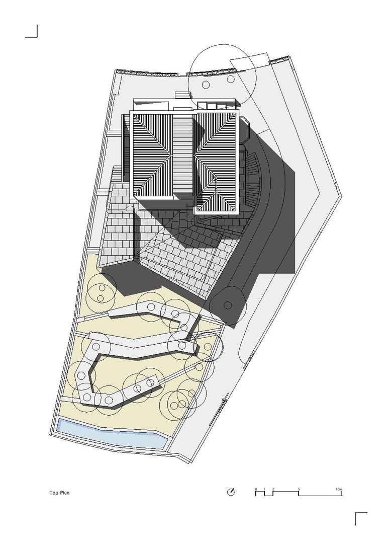 The construction of the new multi-use room, of larger proportions, destined to rehearsals and orchestra concerts, was made by simply extending the stone foundations of the original house to the palm-tree field. Its geometry matches the response to the visual circumstances of the surroundings by framing the environment in an intense relation with the garden. It also secures the specific acoustic demands and allows, at the side of the lot, for the passage of a new street accessing the parking area.