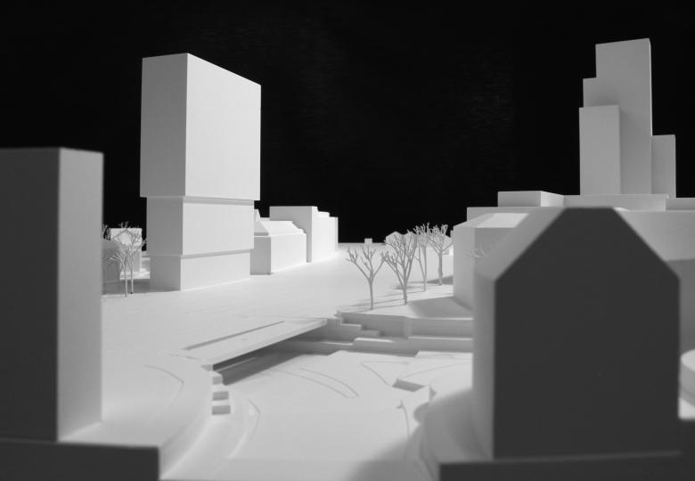 Testplanung – Ein Hochhaus mit konischem Fussabdruck ist der städtebauliche Auftakt des Banane-Areals und weist als Kopf zum Hauptbahnhof. Das nach oben mit Wohnlauben ausgeweitete Volumen bleibt schlank im engen Stadtraum, etabliert eine neue Höhe für Winterthur (niedriger als die Ikonen, höher als Wohn- und Kirchtürme). Es markiert eine eigenständige Silhouette gegenüber den anderen Hochhäusern der Stadt. Der Solitärbau lässt den Nachbarhäusern Raum, seine Längsseite zum Quartier ist kürzer als die zum Gleis. Die abgestufte Höhengliederung vermittelt zum Massstab des Quartiers. Der grosse Vorplatz schafft eine selbstverständliche Verbindung von Strassenkreuzung, Brückenkopf und Gebäudeeingang. Das Hochhaus ist als Holzkonstruktion geplant.